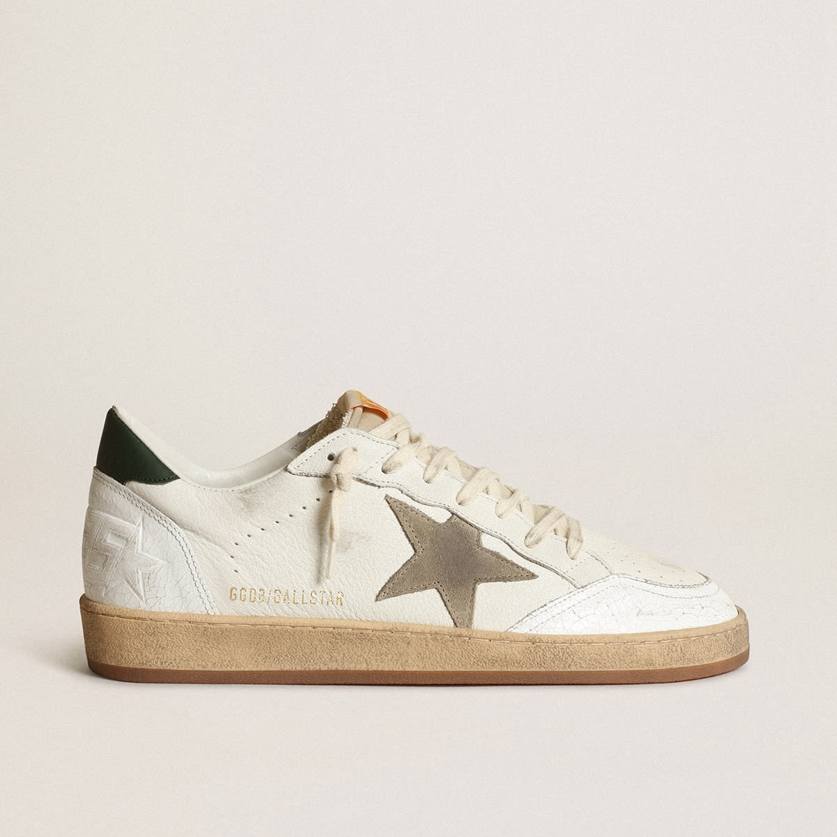 Golden Goose Ball Star Turnschuhe in weißem Nappa-Leder mit Tauben-Grau-Wildlederstern und dunkelgrünem Leder Absatz Tab GMF00117.f003435.11207