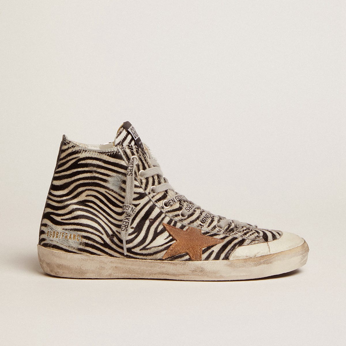 Golden Goose Francy Penstar Ltd Turnschuhe in Zebra-Print-Pony-Haut mit tabakfarbenem Wildlederstar und schwarzer Lederabsatz Tab GWF00114.F002628.815544