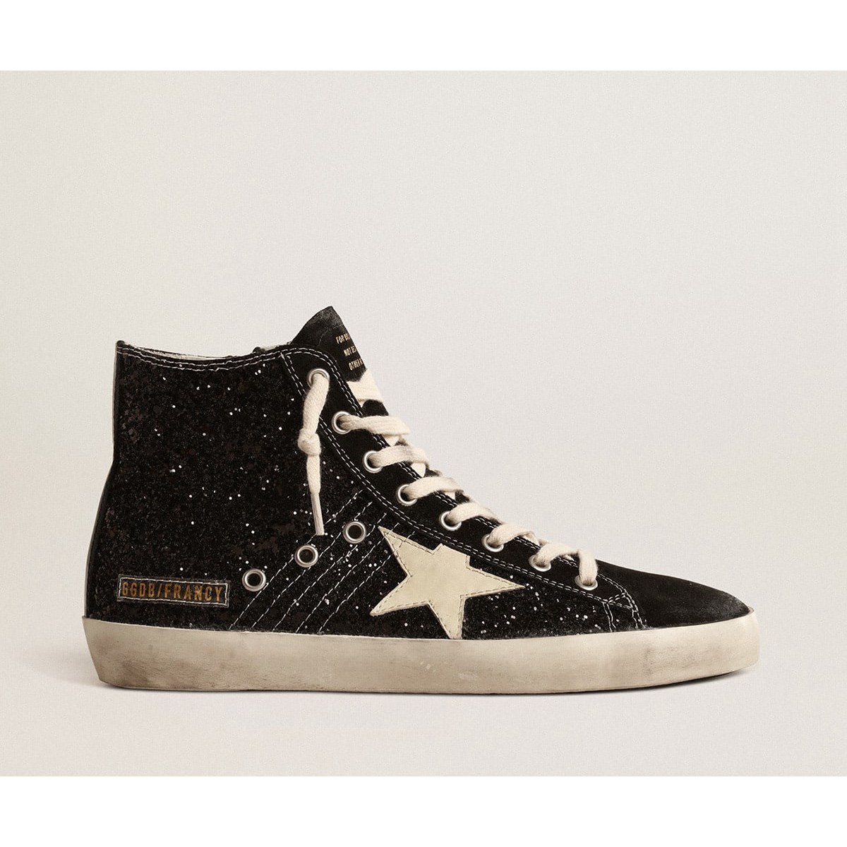 Golden Goose Francy Turnschuhe Penstar Ltd im Glitzer mit Elfenbeinstern und schwarzer Absatz Tab GWF00113.F004558.90232