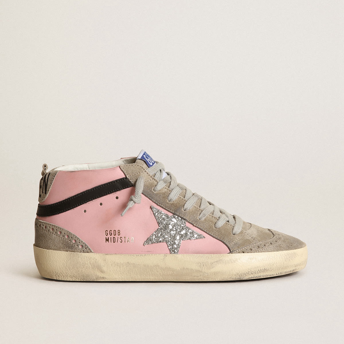 Golden Goose Mid Star Ltd Turnschuhe in rosa Leder mit Silber Glitterstar und schwarzem Lederblitz GWF00122.F003370.81815