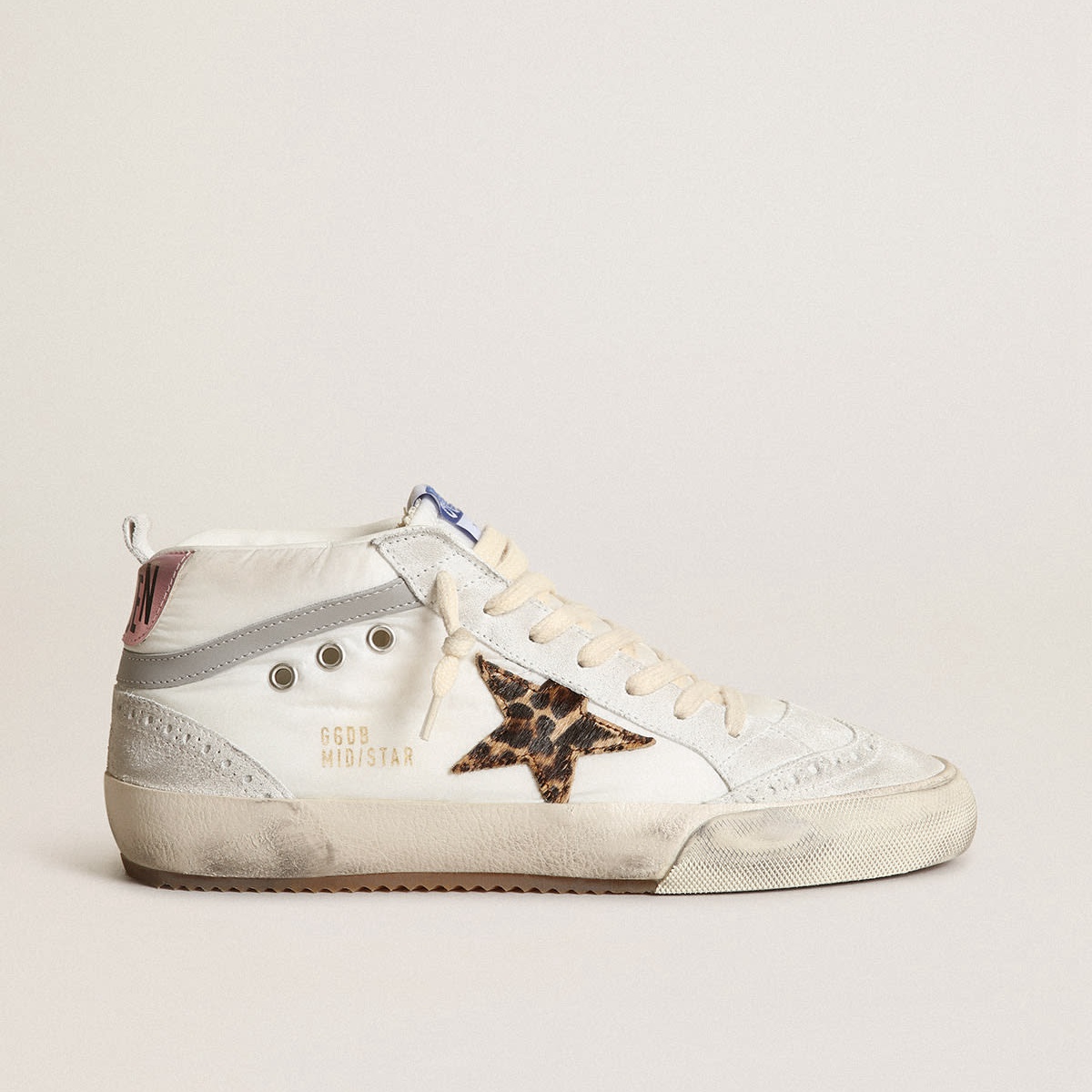 Golden Goose Mid Star Ltd Turnschuhe im weißen Nylon mit Leoparden-Print-Pony-Hautstern und rosa Metallic Leder Absatz GWF00122.f003399.11242