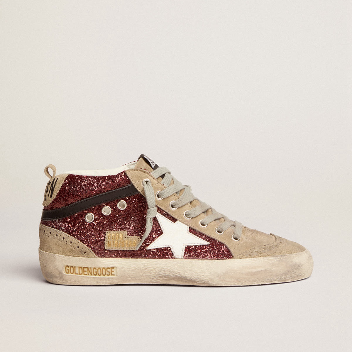 Golden Goose Mid Star Turnschuhe im Burgund-Glitzer mit Tauben-Grau-Einsätzen und weißem Stern GWF00122.F002626.81553