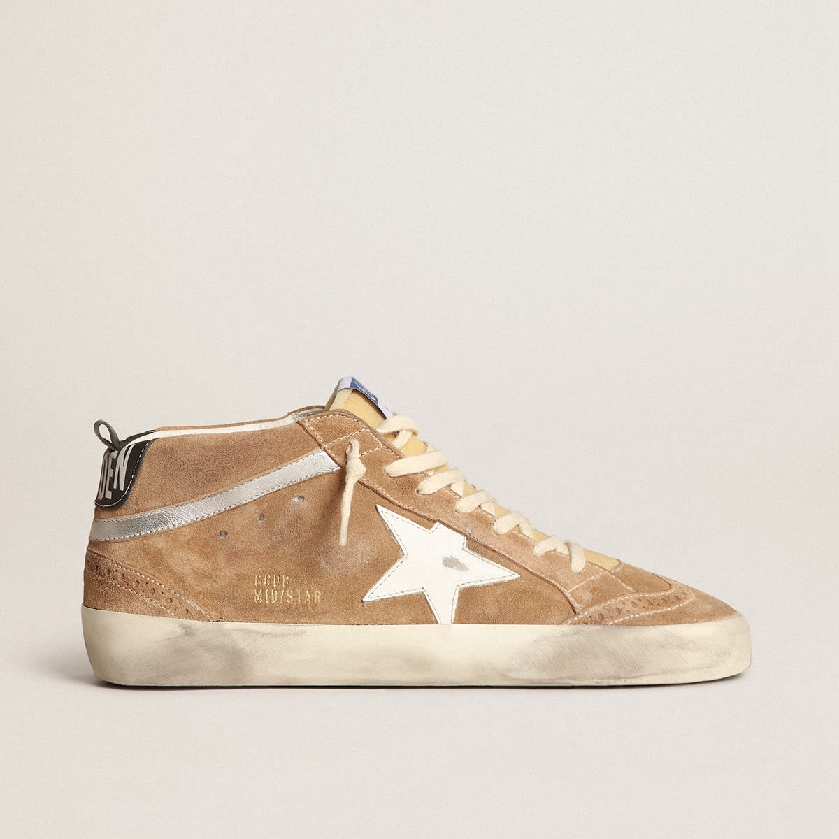 Golden Goose Mid Star Turnschuhe im tabakfarbenen Wildleder mit weißem Lederstern und silbernen Metallic Leder Flash GMF00122.f003767.55510