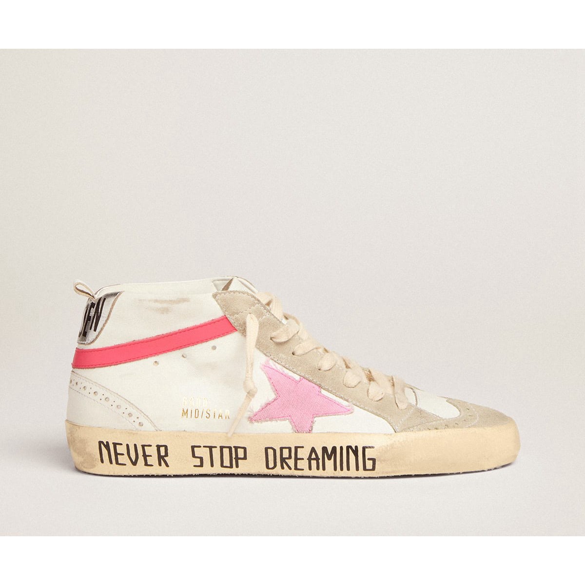 Golden Goose Mid Star Turnschuhe in weißem Leder mit rosa Stern und schwarzen Schriftzug GWF00122.F002625.10928