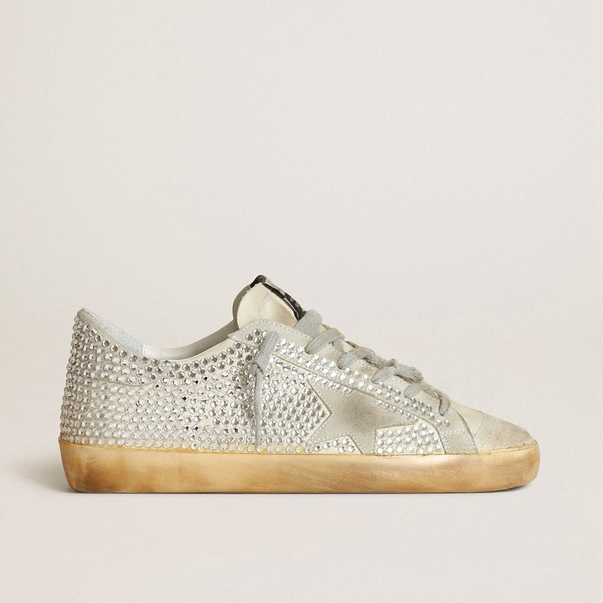 Super-Star-Turnschuhe goldener Gänse in cremefarbenem Nubuck- und Silber-Swarovski-Kristallen mit Eisgrau-Wildleder-Star GWF00174.F003459.10273