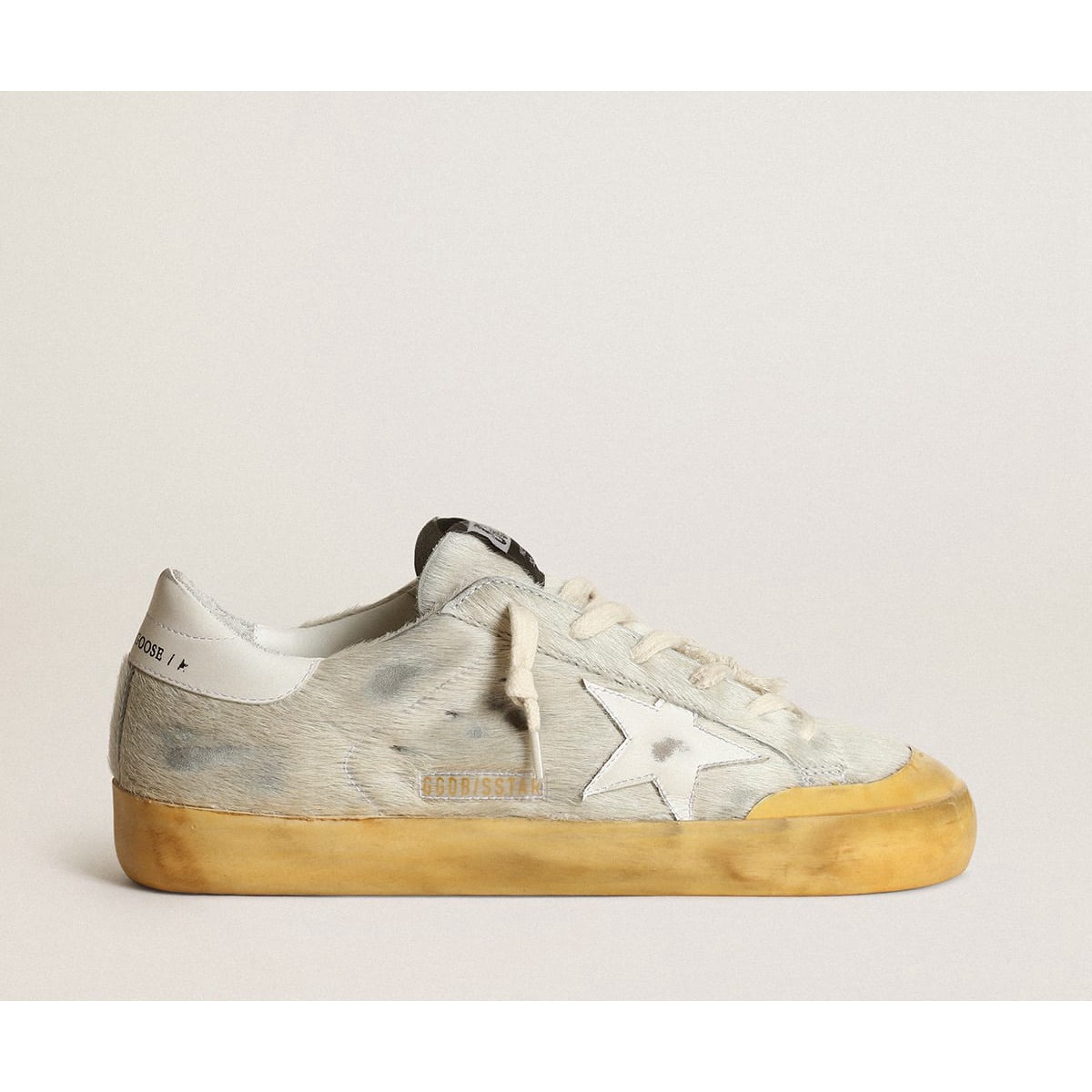 Golden Goose Super-Star Turnschuhe Penstar in cremesweißer Pony-Haut mit weißem Lederstern und Fersenstart GWF00107.f003458.10100