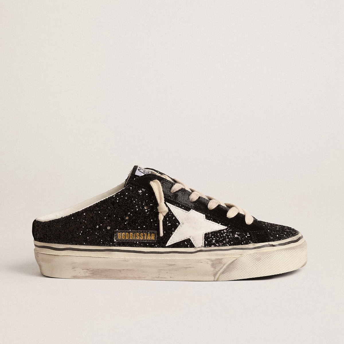 Super-Star-Sabots von Golden Goose im schwarzen Glitzer mit White Bio-basierter Star GWF00485.f004546.80203