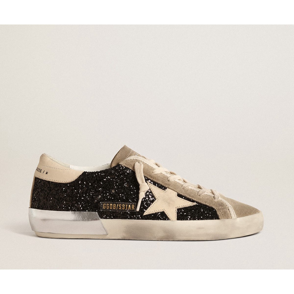 Super-Star-Turnschuhe im Golden Goose im schwarzen Glitzer mit Cream-Stern und Wildledereinsätzen GWF00587.f004683.90401