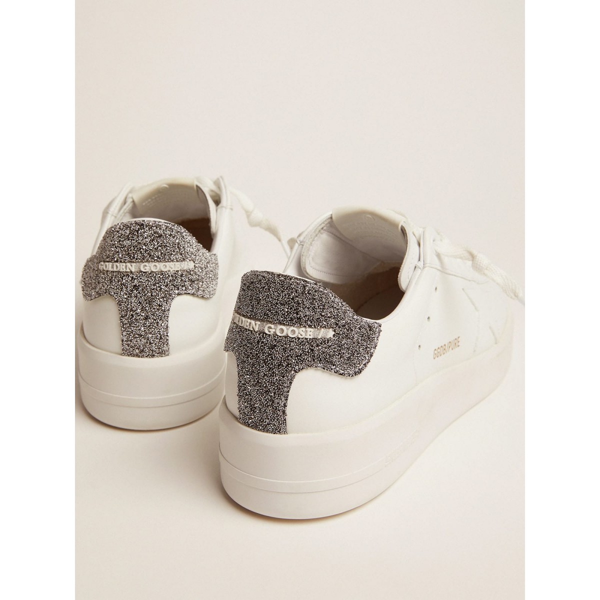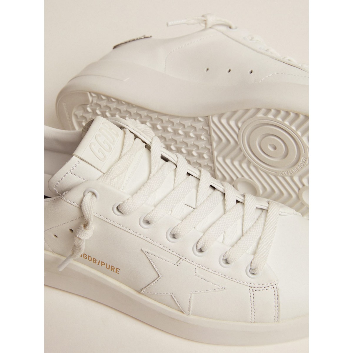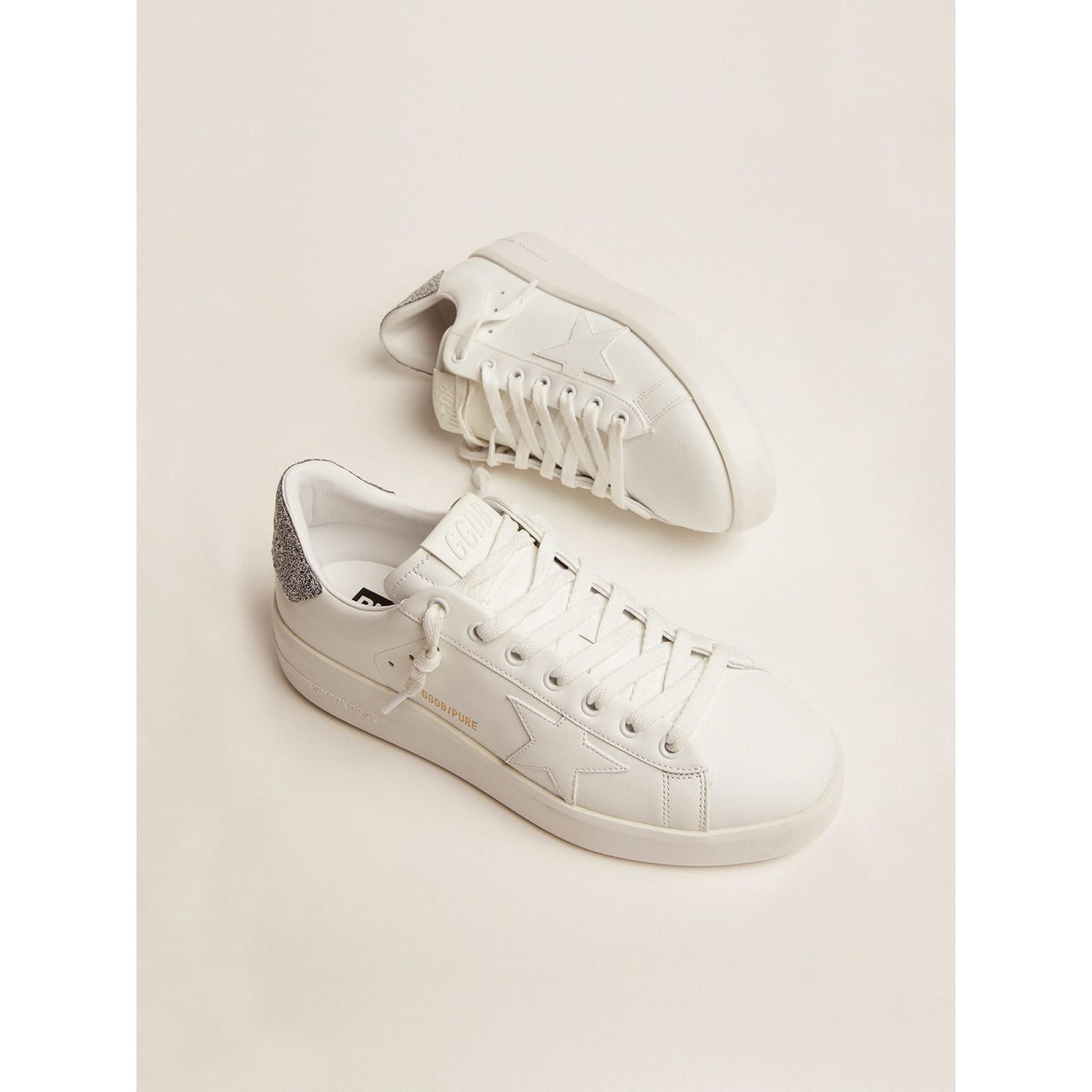 Wenn der Minimalismus der Form der Stärke der Details entspricht: Unsere Purestar-Turnschuhe kombinieren dank ihrer schockabsorbierenden Technologie einen zurückhaltenden Stil mit extremem Komfort. Dieses Modell besteht aus weißem Leder und verfügt über eine silberne Swarovski -Kristallabsatzlasche und einen erhöhten weißen Stern. Farbe: Weiß und Silber