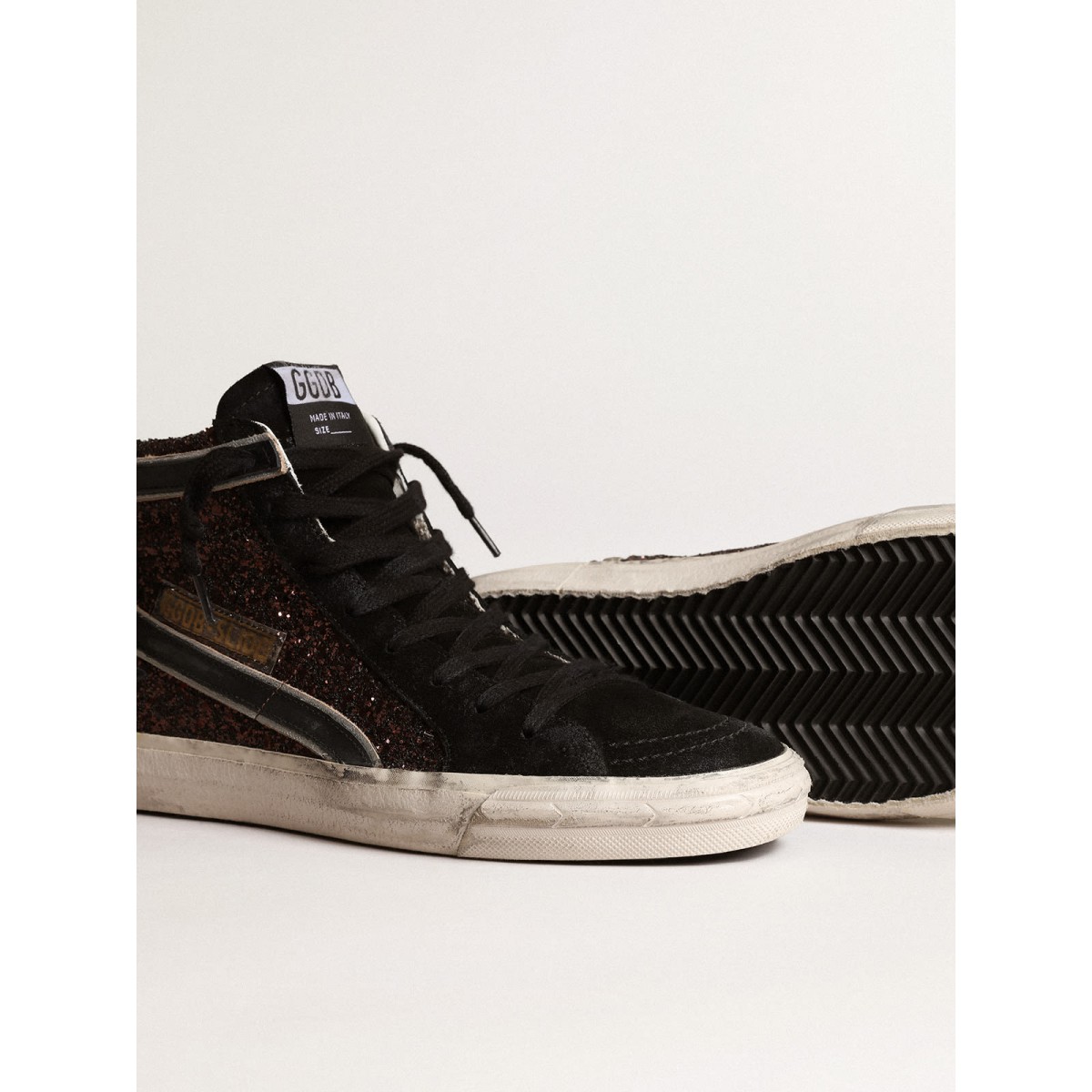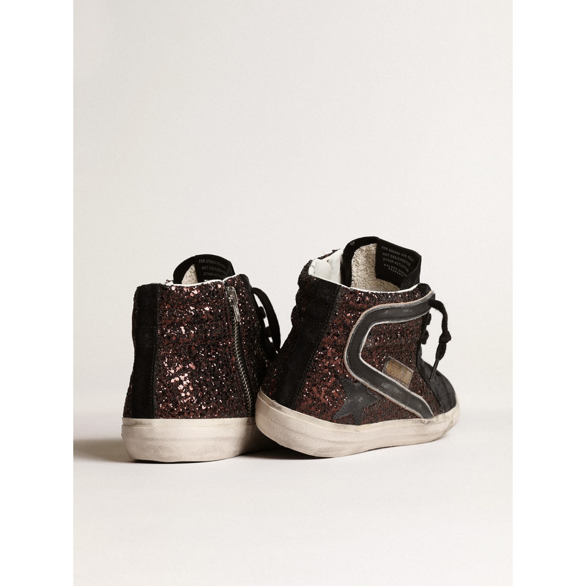 Skate -Seele, glamouröse Haltung. Unsere Rutschen -Turnschuhe bringen Sie direkt nach Venice Beach zwischen einem Ollie und einem Kickflip. Dieses Modell mit einem braunen Glitzer -Obermaterial mit schwarzen Wildledereinsätzen enthält schwarze Lederdetails wie den Stern und den Blitz mit silbernem Metallic -Leder. Und schwarze Schnürsenkel Fügen Sie den letzten Schliff hinzu.>Schwarzer Lederstern