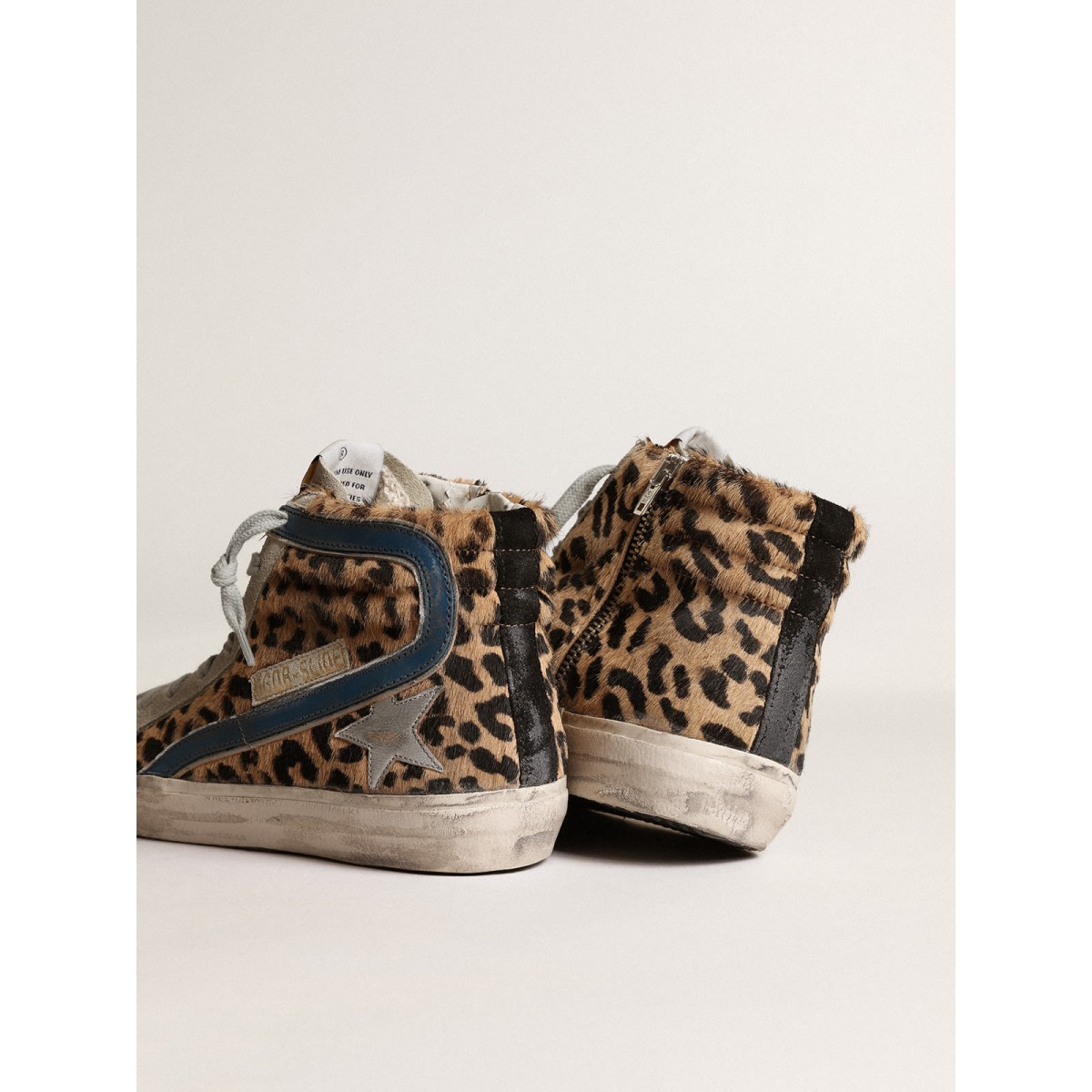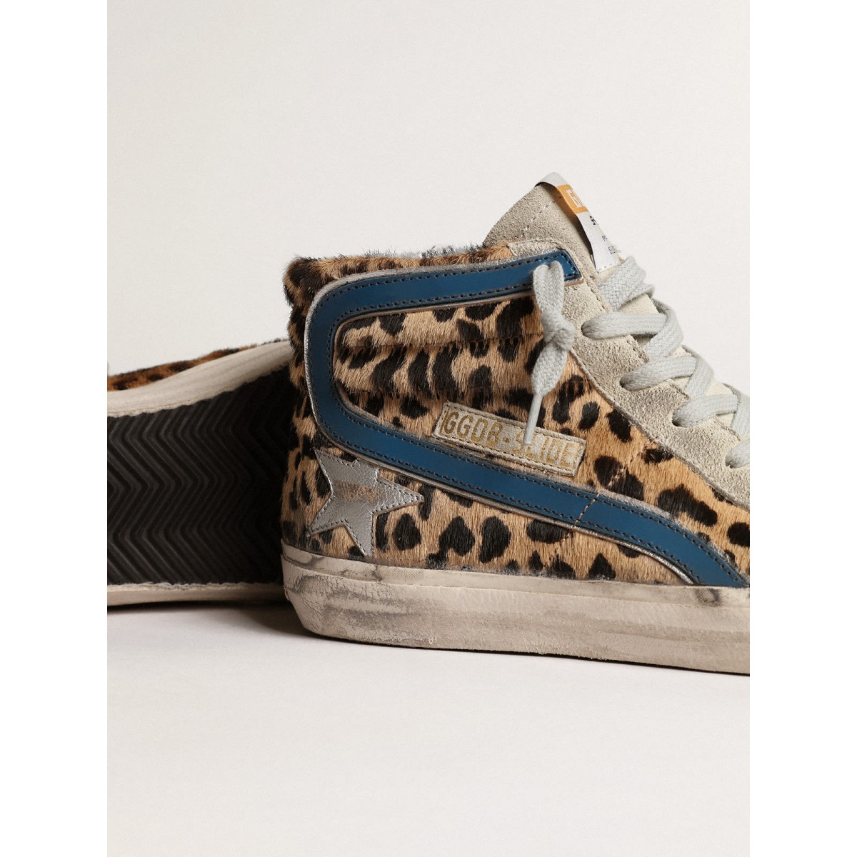 Skate -Seele, glamouröse Haltung. Unsere Rutschen -Turnschuhe bringen Sie direkt nach Venice Beach zwischen einem Ollie und einem Kickflip. Dieses Modell mit einem oberen oberen Leoparden-Print-Pony-Haut verfügt über einen silbernen metallischen Lederstern und einen Benzinblauen-Lederblitz mit silbernen Metallic Lederkanten. Wildledereinsätze, einschließlich der Eiszunge und der schwarzen Fersenlasche, und der Eisgrau-Schnürsenkel fügen den Finishing Touch hinzu. P>