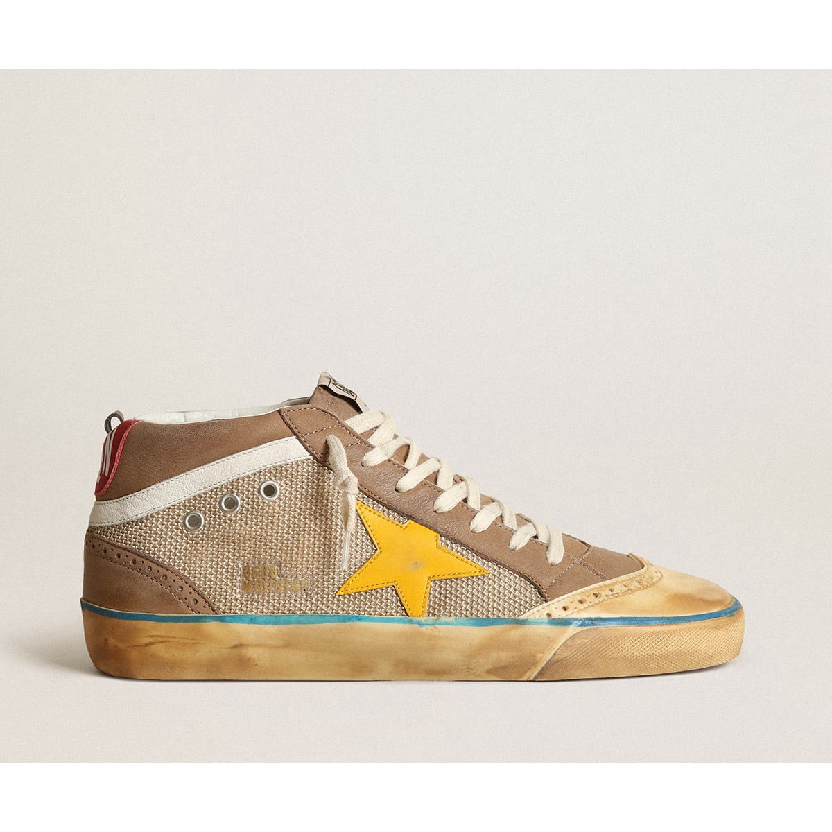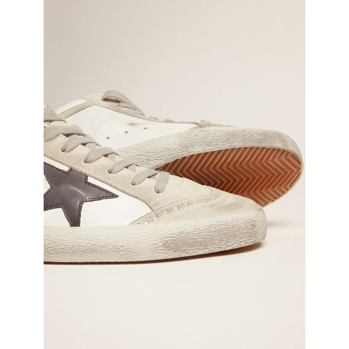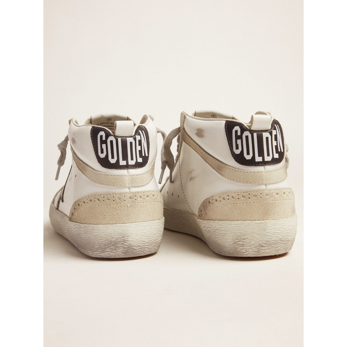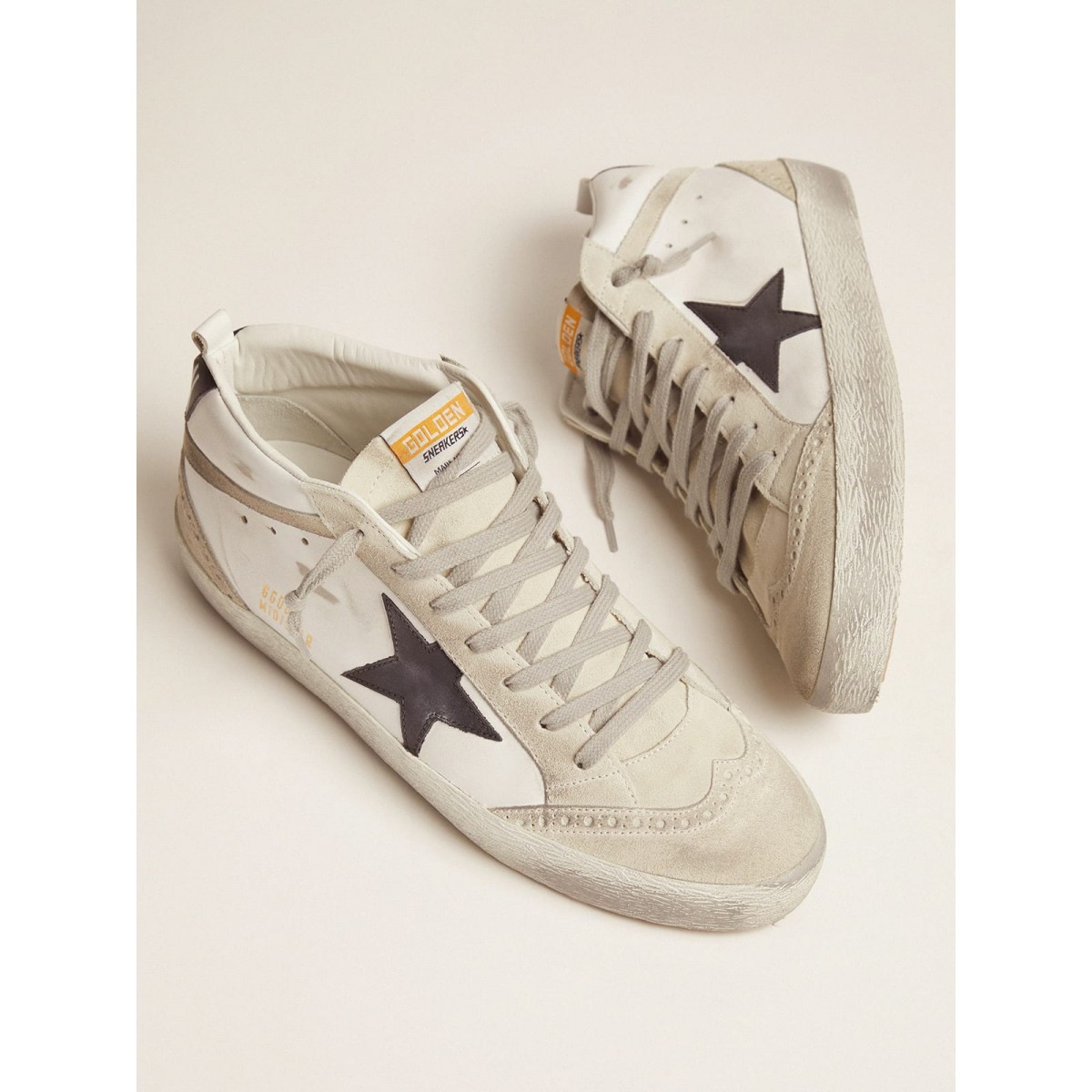 Ein ungezwungener Look, der Streetwear -Eleganz ausstrahlt: Ein Modell, das den goldenen Gänsestil dank der Verwendung exklusiver Behandlungen und Oberflächen interpretiert. Diese Mid -Stern -Turnschuhe verfügen über ein weißes und graues Leder- und Wildleder -Obermaterial und einen schwarzen Stern. : 100% Cowhide Leder