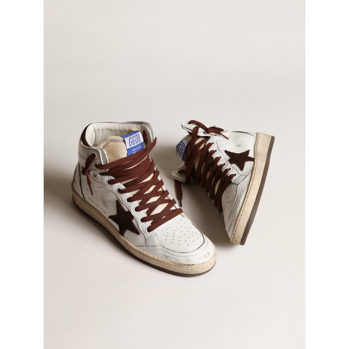 Eine Neuinterpretation von High-Top-Turnschuhen mit einer authentischen Seele: Inspiriert von unserem Ballsternmodell haben unsere Sky-Star-Sneakers eine amerikanische College-Atmosphäre und ein Gefühl der Basketball-Szene der achtziger Jahre. Dieses Frauenmodell mit einem weißen Nappa -Leder -Obermaterial verfügt über einen Schokoladen -Wildlederstern und die goldene Gänsehaut am Hals des Knöchels, ein Hinweis auf den Kindheitstraum, wenn Sie Ihre Lieblings -Sneaker von Basketballlegenden unterschrieben haben. Die Schokoladen Wildledereinsätze und braunen Schnürsenkel vervollständigen den Look. li>Schokoladen Wildlederstern
