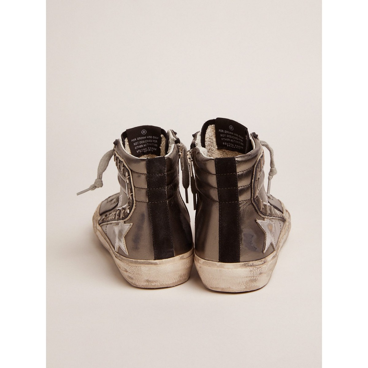 Golden Gans Slide-Turnschuhe mit silbernen laminierten Leder-Obermaterial und sternförmigen Stollen GWF00115.f001711.90179