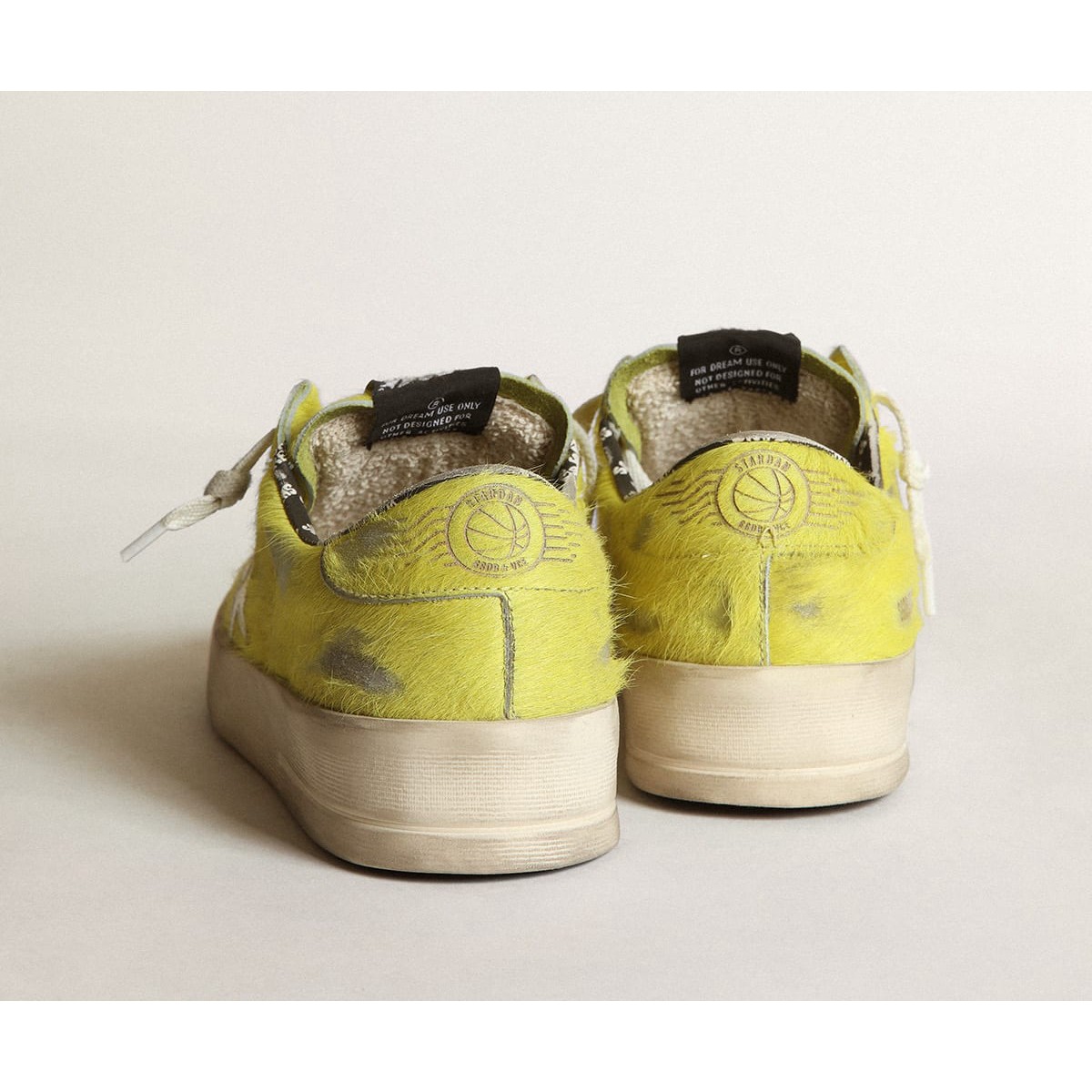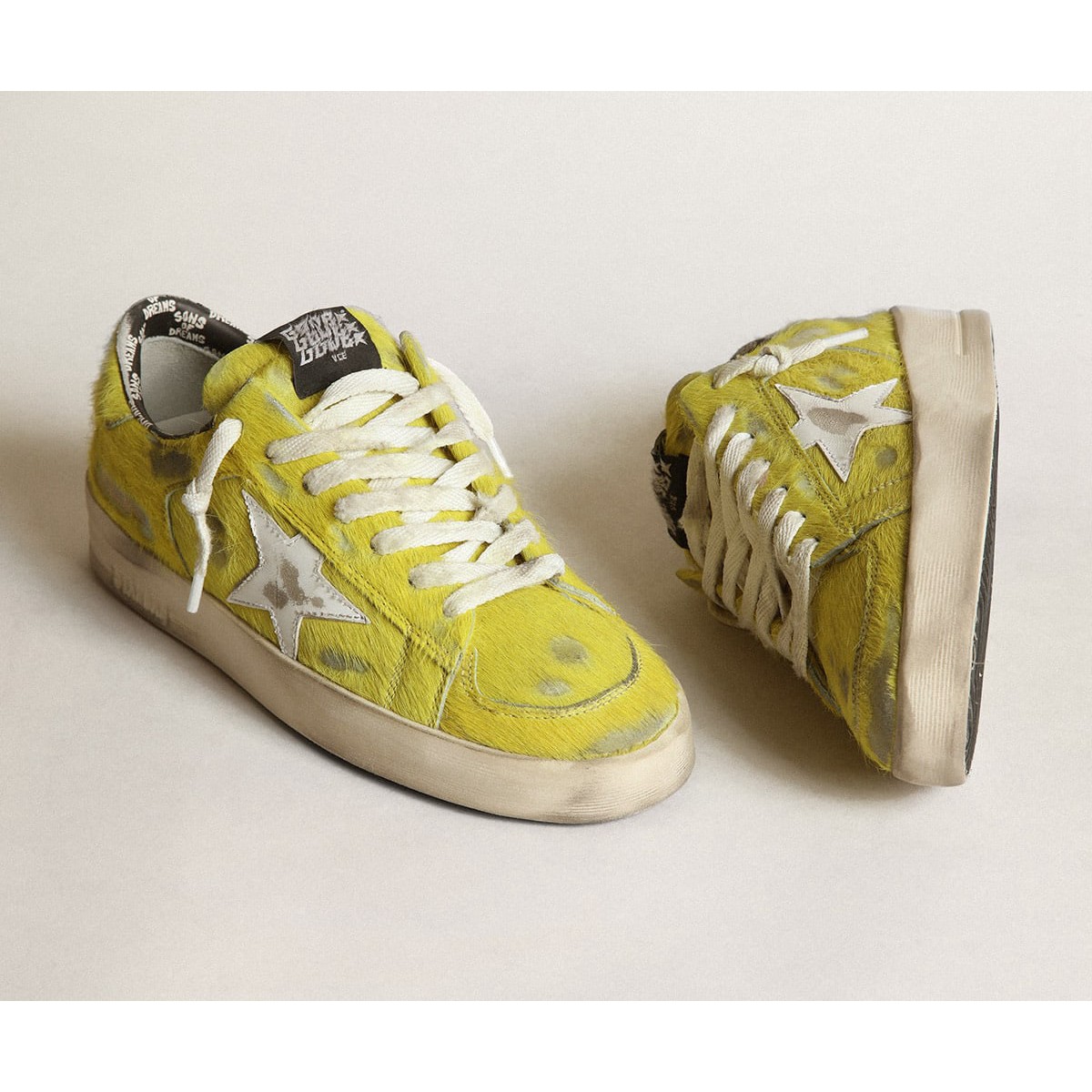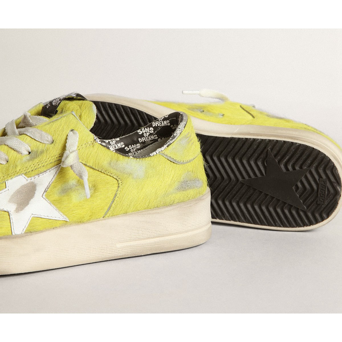 Die glorreichen neunziger Jahre in einem Sneaker. Die Stardan -Turnschuhe huldigen den Basketballikonen dieses Jahrzehnts und halten die Gegenwart im Auge. In dieser Frauenversion verfügt das obere Fluorescent Yellow Pony Skin über einen weißen Lederstern und einen Ton-auf-Ton-Fersen-Tab. Die schwarze Auskleidung mit kontrastierenden weißen Träumensschriften und den weißen Schnürsenkeln fügen den Finishing -Touch hinzu. li>fluoreszierendes gelbes Ponyhaut Obermaterial