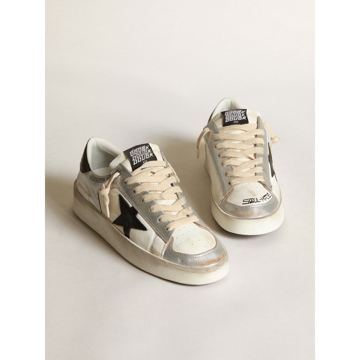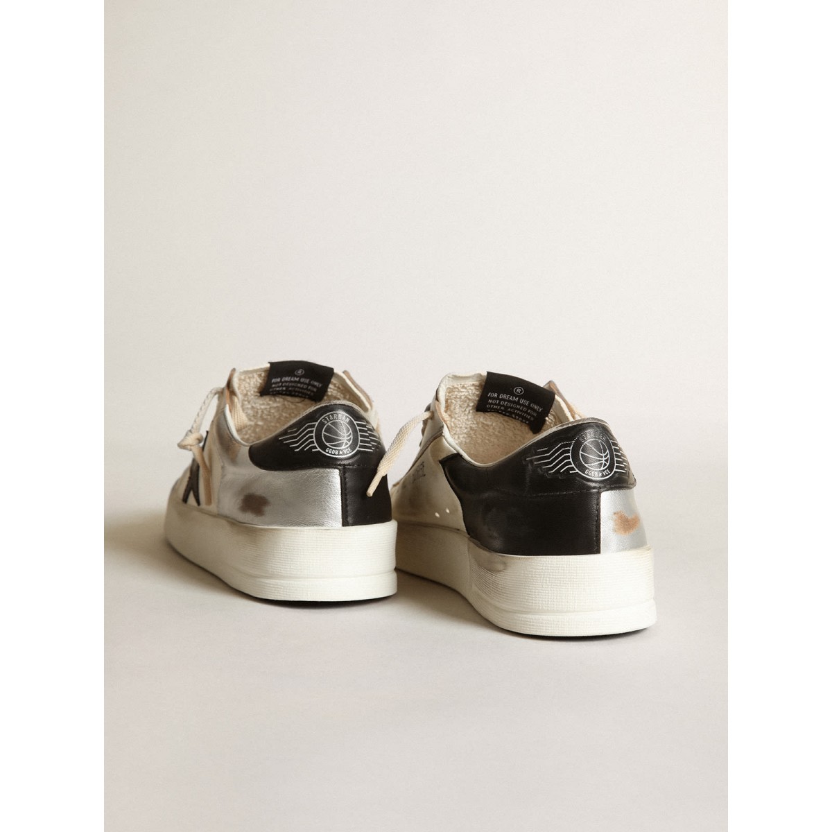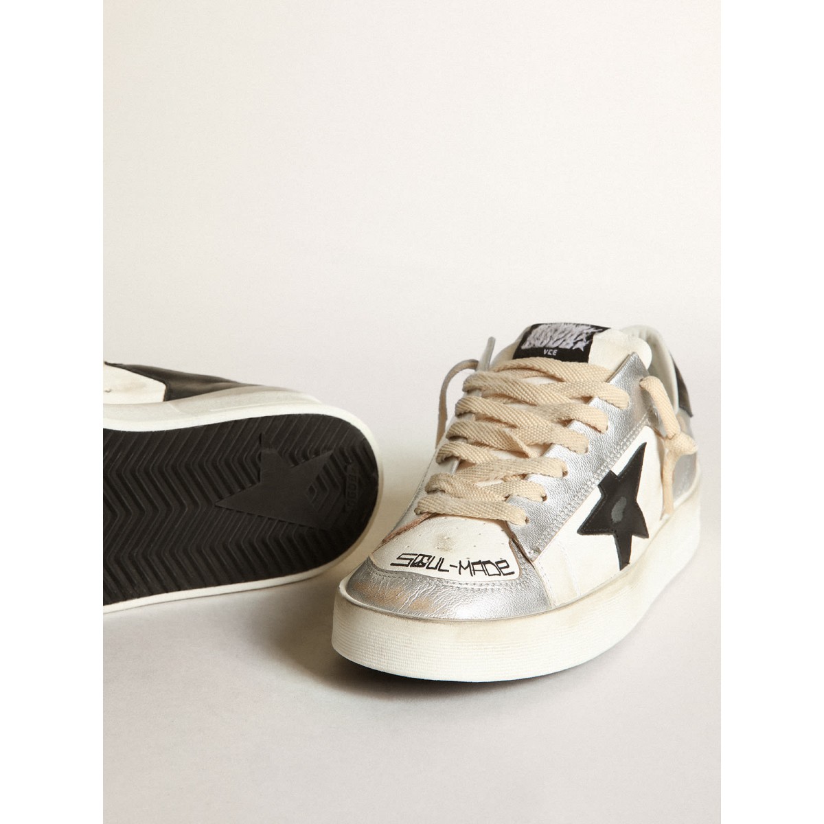 Golden Gans Stardan Turnschuhe in silberlaminiertem Leder mit weißen Nappa Ledereinsätzen und einem schwarzen Lederstar GWF00128.f003447.10250