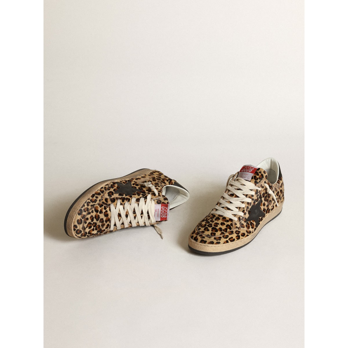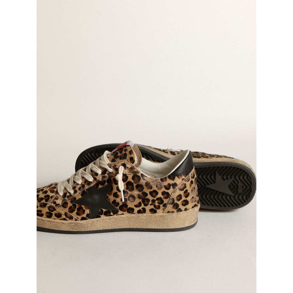 Von den achtziger Jahren träumen. Unsere Ballstar -Sneakers haben eine amerikanische College -Atmosphäre zwischen einem Reifenschuss und einer Skateboardfahrt. Dieses Modell in Leoparden-Print-Pony-Haut mit beige und braunen Farbfarben verfügt über einen schwarzen Lederstern und eine Fersenlasche. Die Creme Schnürsenkel vervollständigen den Stil: Schöne Dinge, die niemals aus der Mode gehen. -Print Pony Skin Obermaterial