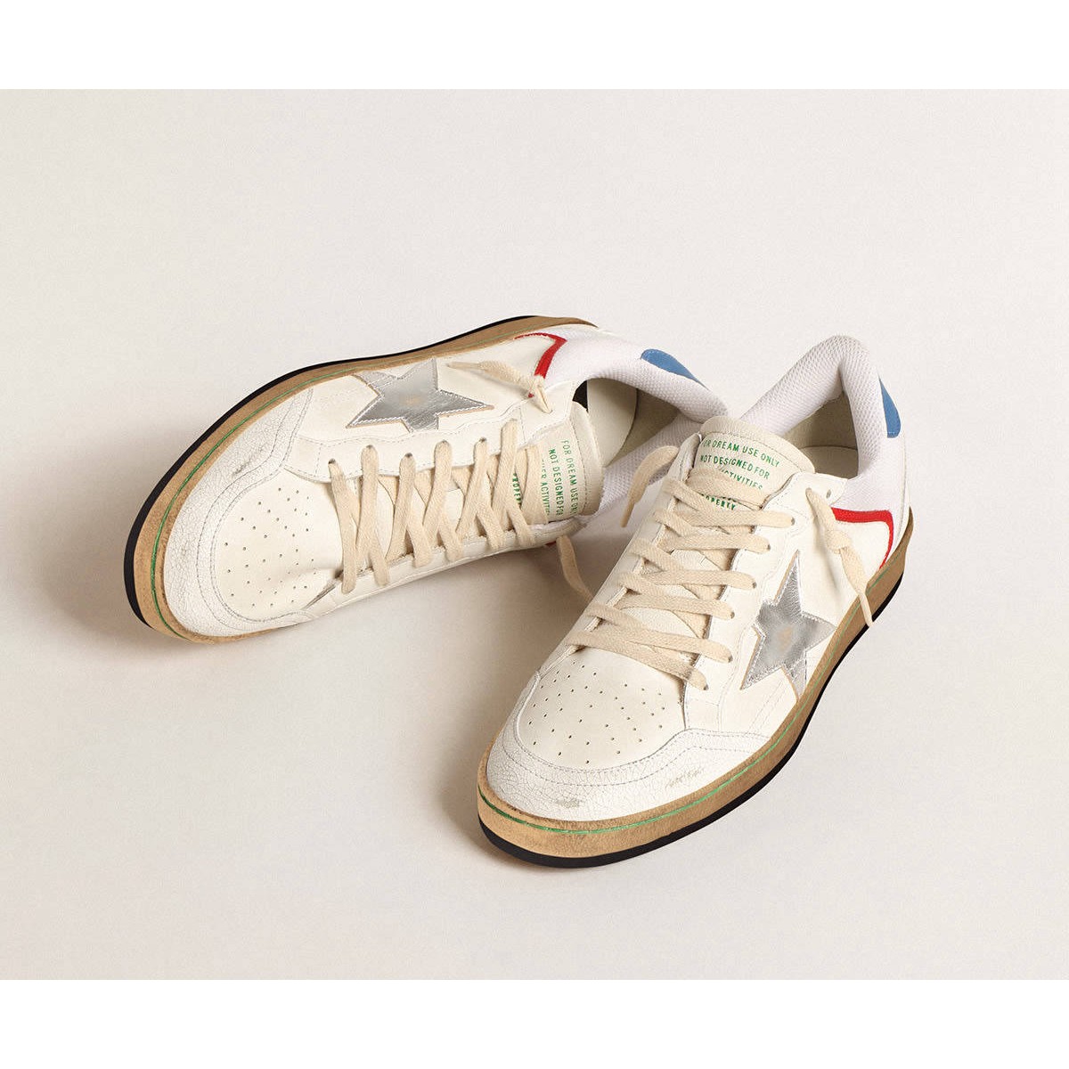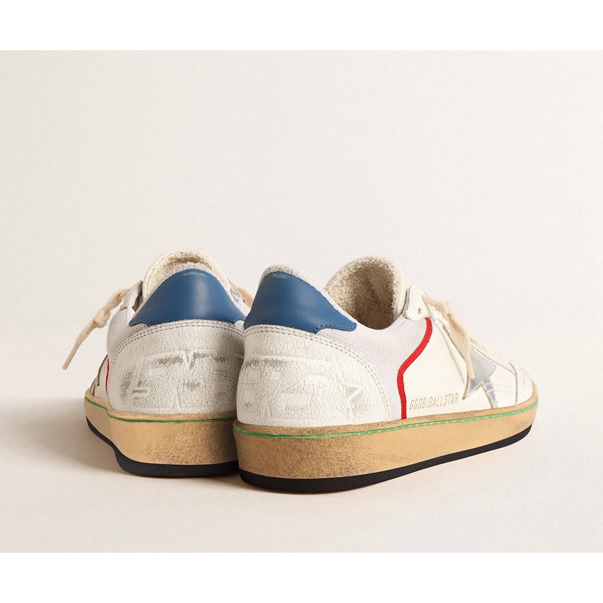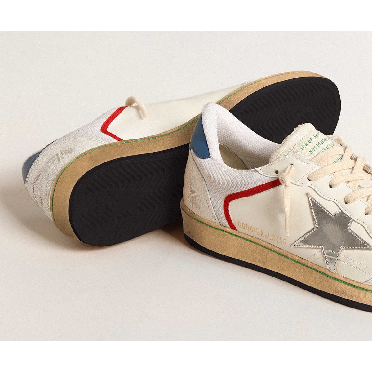 träumt von den achtziger Jahren. Unsere Ballstar -Sneakers haben eine amerikanische College -Atmosphäre zwischen einem Reifenschuss und einer Skateboardfahrt. Dieses Modell mit einem weißen Nappa -Leder und einem Mesh Upper verfügt über einen silbernen metallischen Lederstern und einen blauen Lederabsatzstab. Die White Crackle Ledereinsätze, rote Details und beige Schnürsenkel Fügen Sie den letzten Schliff hinzu: Schöne Dinge, die niemals aus der Mode gehen. P>
