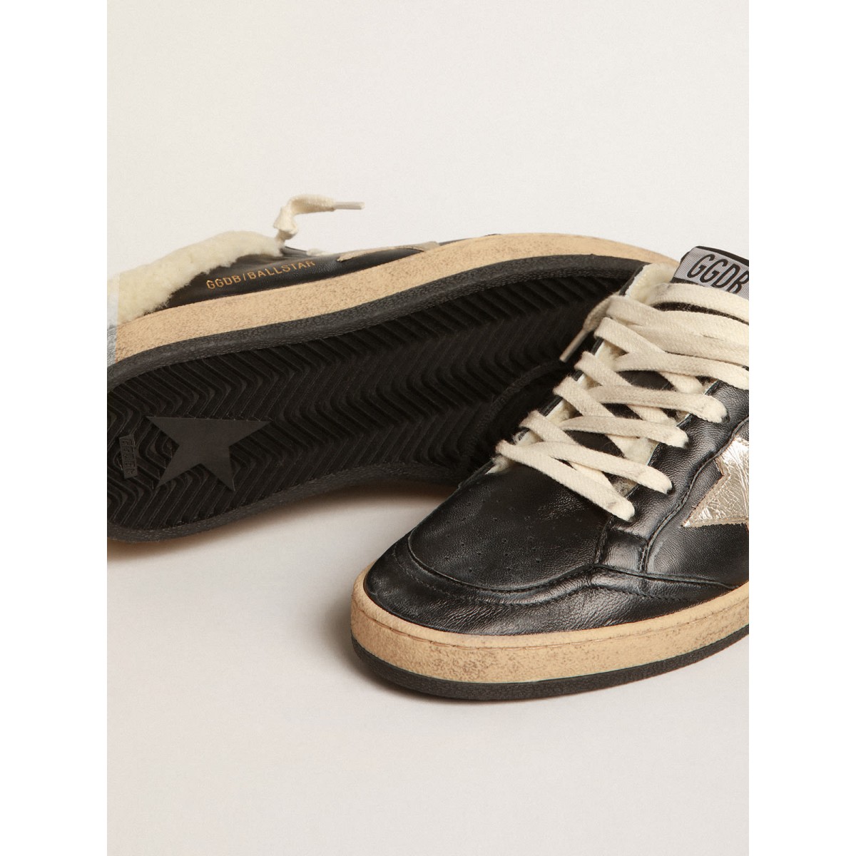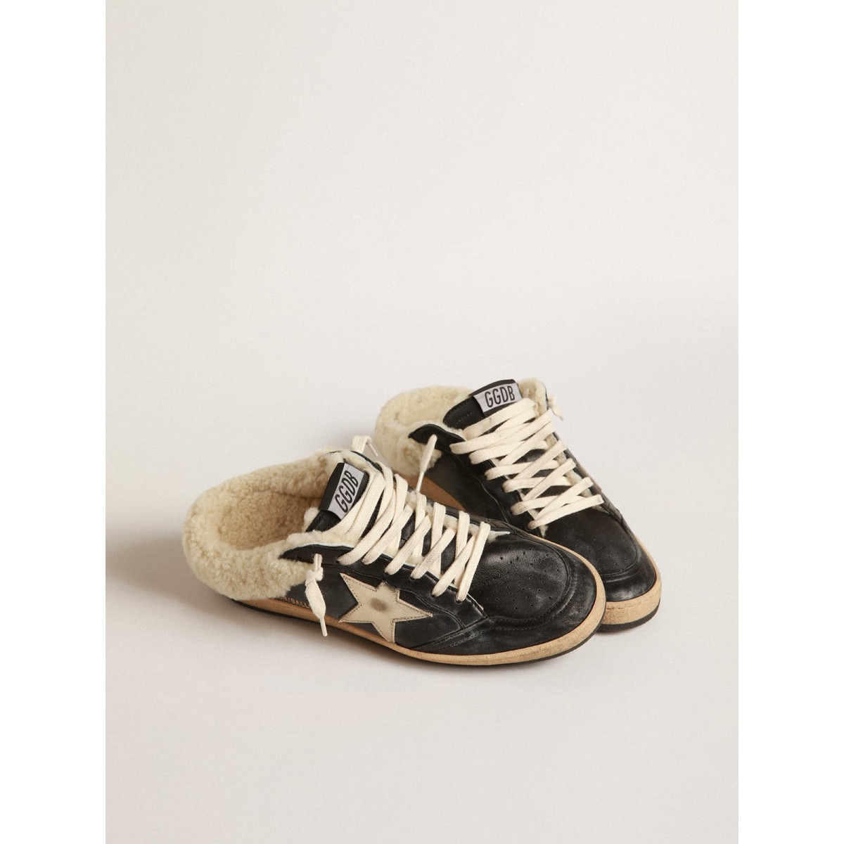 Von den achtziger Jahren träumen. Unsere Ballstar -Sneakers haben eine amerikanische College -Atmosphäre zwischen einem Reifenschuss und einer Skateboardfahrt. Dieses Sabot-Version-Modell mit weicher Beige-Shearling verfügt über ein schwarzes Nappa-Leder-Obermaterial, das mit einem Platin-metallischen Lederstern akzentuiert ist. Die Creme Schnürsenkel Fügen Sie den letzten Schliff hinzu: Schöne Dinge, die niemals aus der Mode gehen. Upper