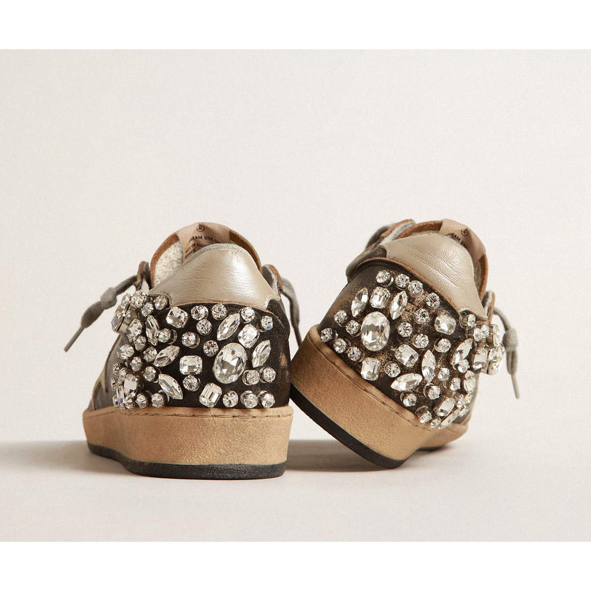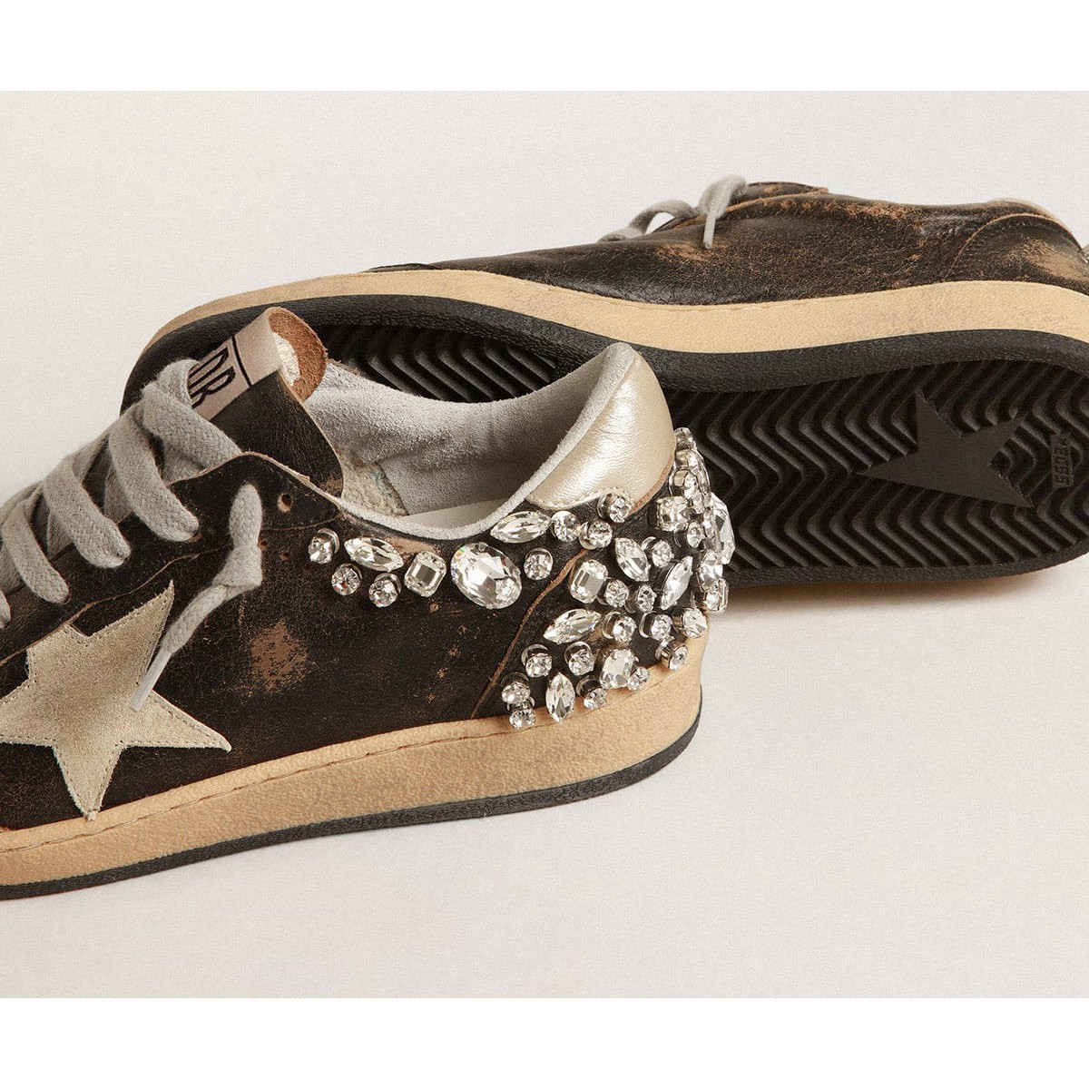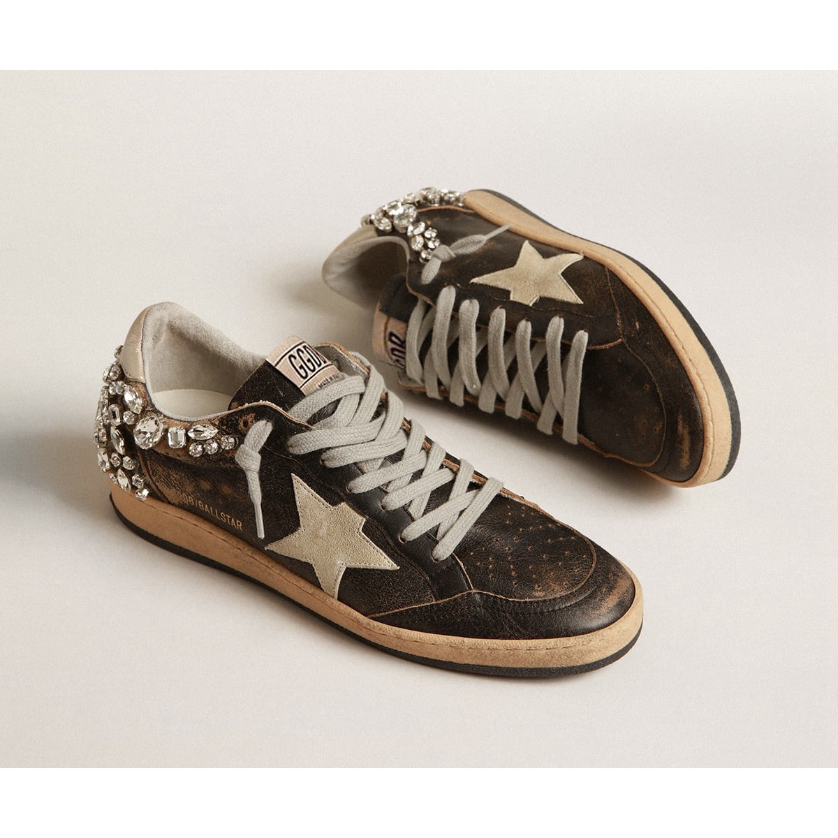 Träume von den achtziger Jahren. Unsere Ballstar -Sneakers haben eine amerikanische College -Atmosphäre zwischen einem Reifenschuss und einer Skateboardfahrt. Dieses schwarze Ledermodell verfügt über einen sandfarbenen Wildlederstern und eine Elfenbeinschale in Laminat-Effect Nappa-Leder. Die Kristalldekoration auf der Rücken- und Eisgrauen-Schnürsenkel fügt den letzten Schliff hinzu: Schöne Dinge, die niemals aus der Mode gehen./>