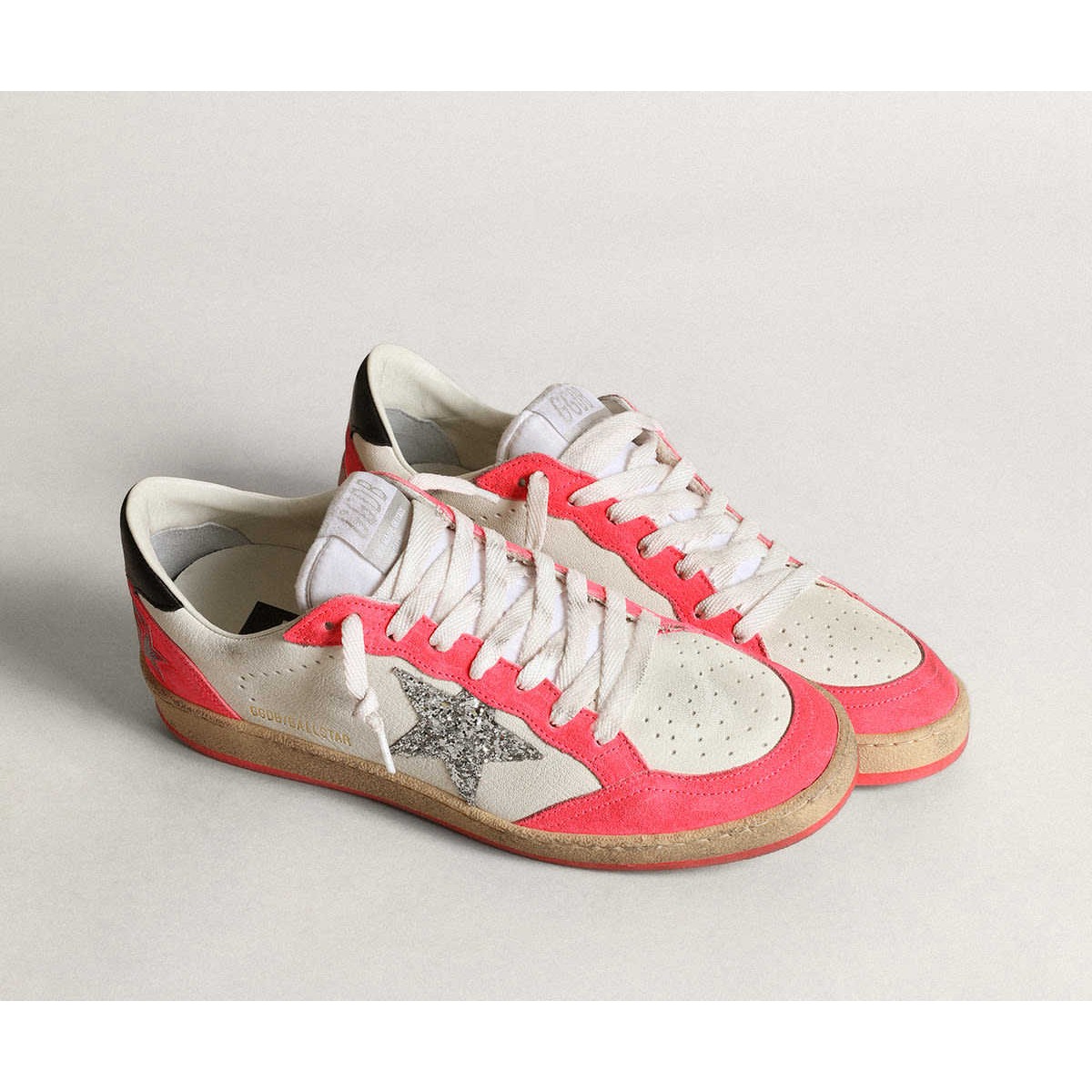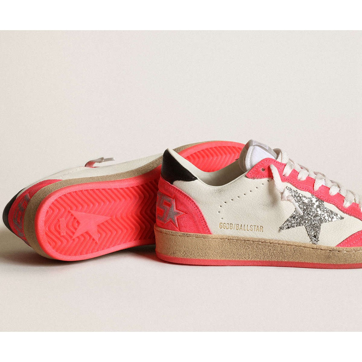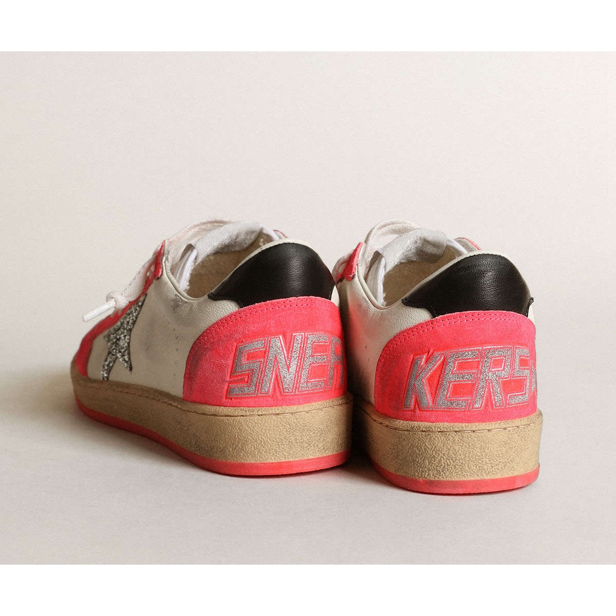 Golden Goose Women’s Ball Star-Sneakers in weißem Nappa-Leder mit Silber-Glitzer-Stern und fluoreszierendem Hummer-Farben-Wildledereinsatz
