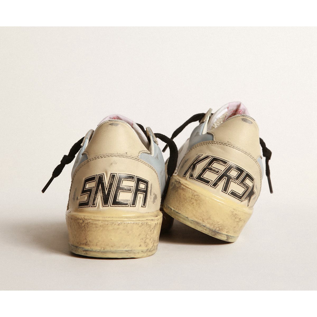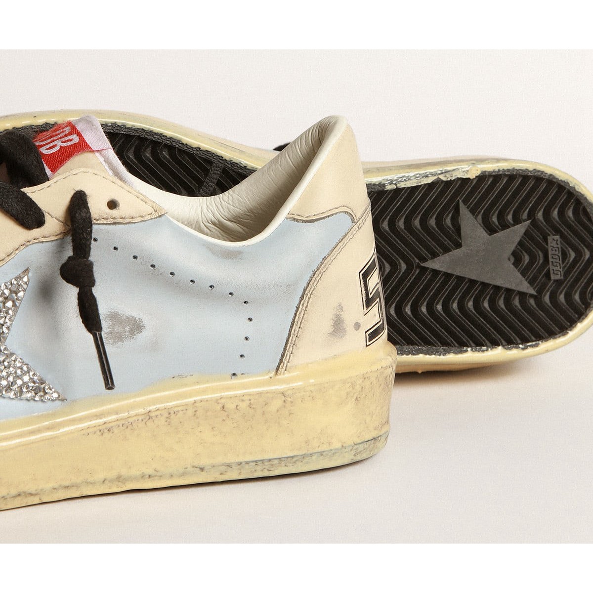 Träume von den Achtzigern. Unsere Ballstar -Sneakers haben eine amerikanische College -Atmosphäre zwischen einem Reifenschuss und einer Skateboardfahrt. Diese nummerierten Labor-Sneaker in limitierter Auflage bieten ein rauchiges, hellblaues Leder-Obermaterial mit einem silbernen Swarovski-Stern und einer Fersenlasche in cremefarbenem Leder. Und die schwarzen Schnürsenkel fügen den letzten Schliff hinzu: Schöne Dinge, die niemals aus der Mode gehen.>Rauchblaues Leder-Obermaterial