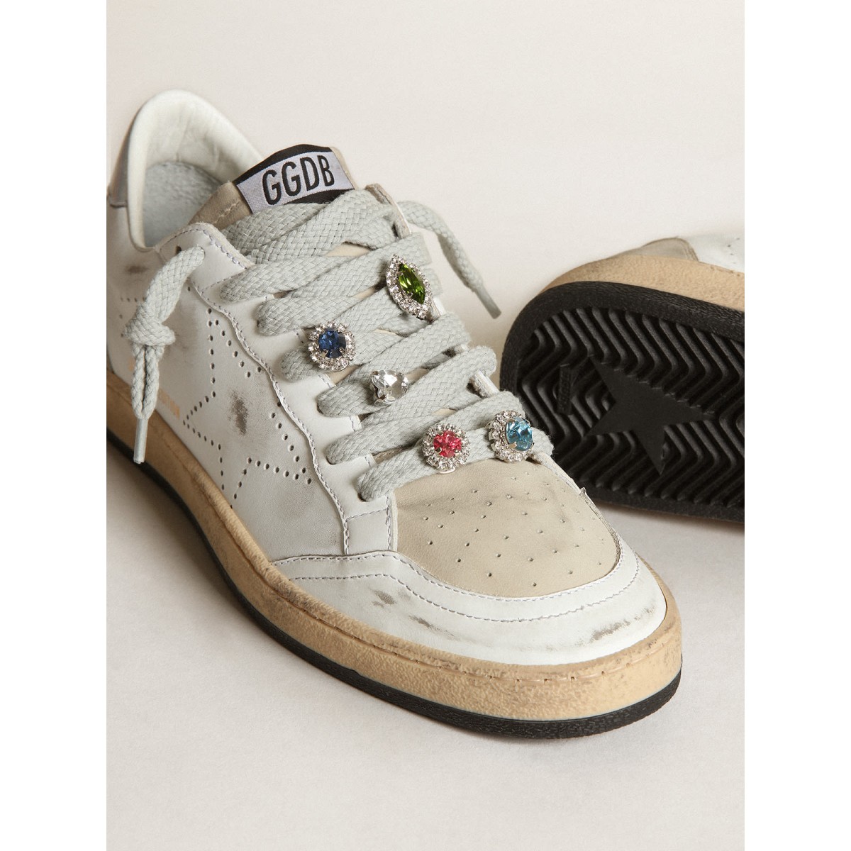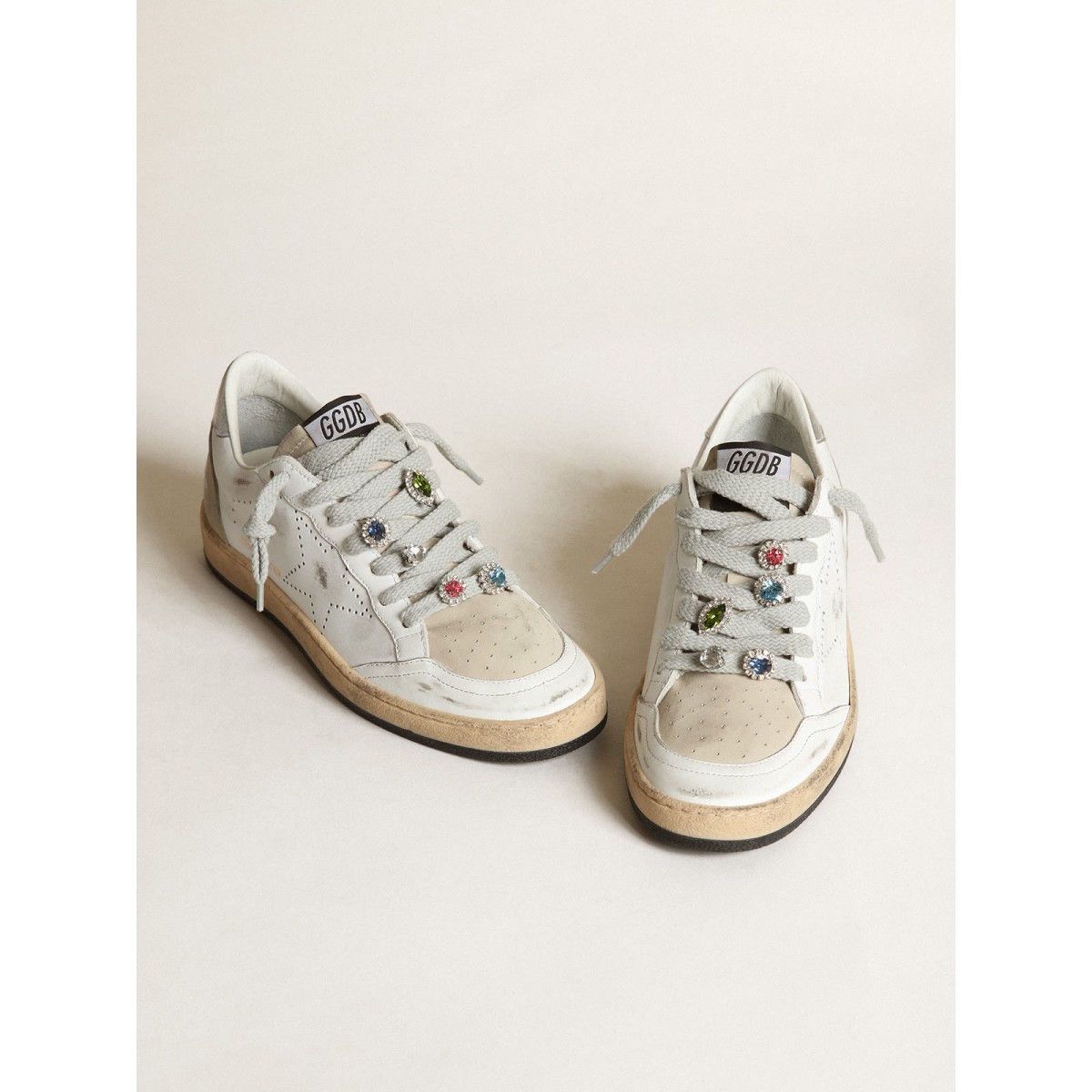 Golden Goose Ball Stern Labor Labor in weißem Leder mit perforierten Stern- und Spitzenzubehör mit mehrfarbigen Kristallen GWF00243.f003143.10276