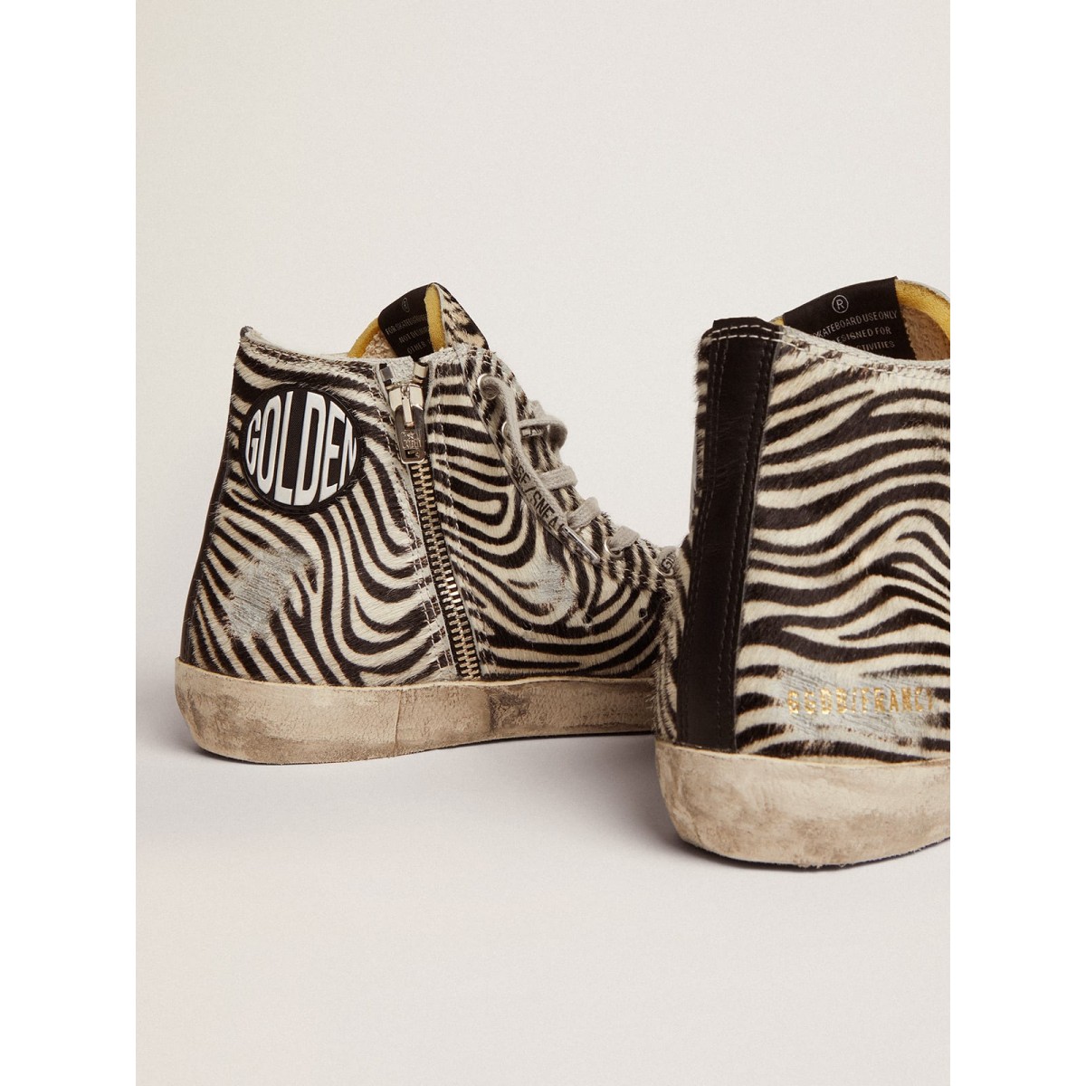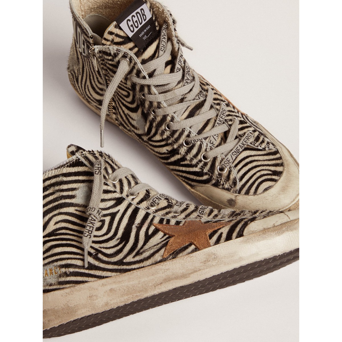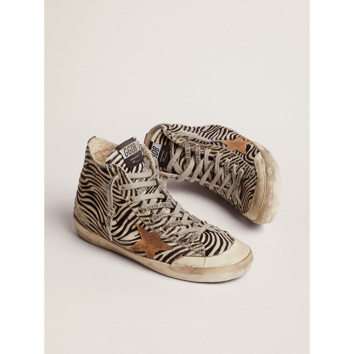 Golden Goose Francy Penstar Ltd Turnschuhe in Zebra-Print-Pony-Haut mit tabakfarbenem Wildlederstar und schwarzer Lederabsatz Tab GWF00114.F002628.815544