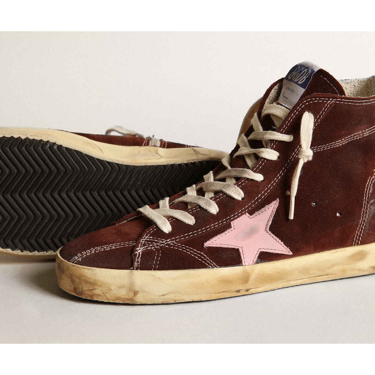 Golden Goose Damen Francy Sneakers im braunen Wildleder mit rosa Lederstar und schwarzer Nappa -Leder -Fersen -Tab