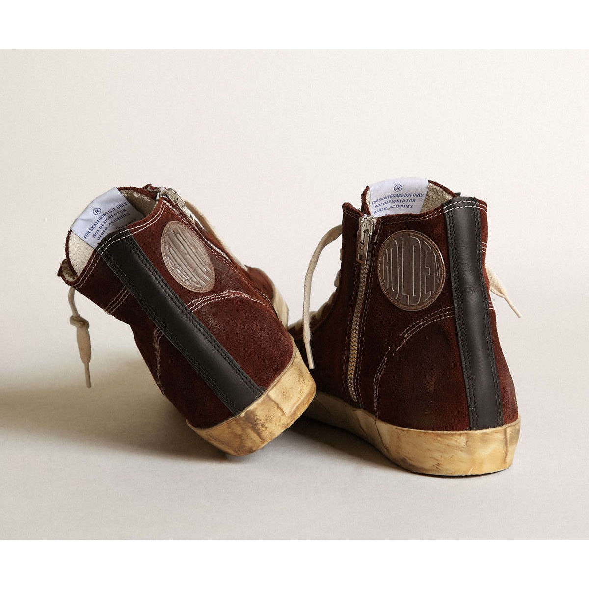 In den siebziger Jahren, inspiriert von der Welt des Basketballs, wird der Stil der Francy Sneakers mit unerwarteten Details und besonderen Oberflächen aktualisiert. Dieses Modell mit einem braunen Obermaterial aus Wildleder verfügt über einen rosa Lederstern und einen schwarzen Nappa -Leder -Fersenlasche. Die kontrastierenden cremefarbenen Nähte auf den oberen und cremefarbenen Schnürsenkeln fügen den Finishing-Touch hinzu. UPPERTED