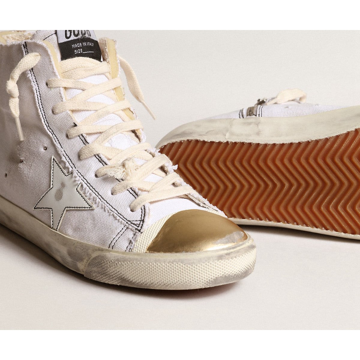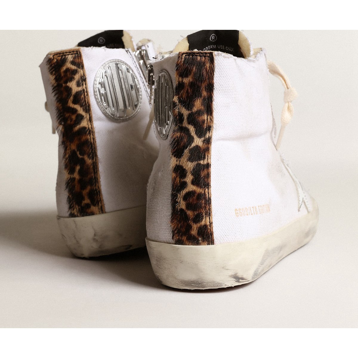 Die Seventies, heute: Inspiriert von der Welt des Basketballs, inspiriert von der Welt des Basketballs, inspiriert von Basketball, Der Stil der Francy Sneakers wird mit unerwarteten Details und besonderen Oberflächen aktualisiert. Diese nummerierten Labor -Sneaker in limitierter Auflage bieten ein weißes Leinwand -Obermaterial und einen weißen Lederstern, beide durch kontrastierende schwarze Nähte. Der Zeh in goldenem metallischem Leder, die Lasche mit Leoparden-Druck-Pony-Haut und die cremefarbenen Schnürsenkel fügen den letzten Schliff hinzu. /p>
