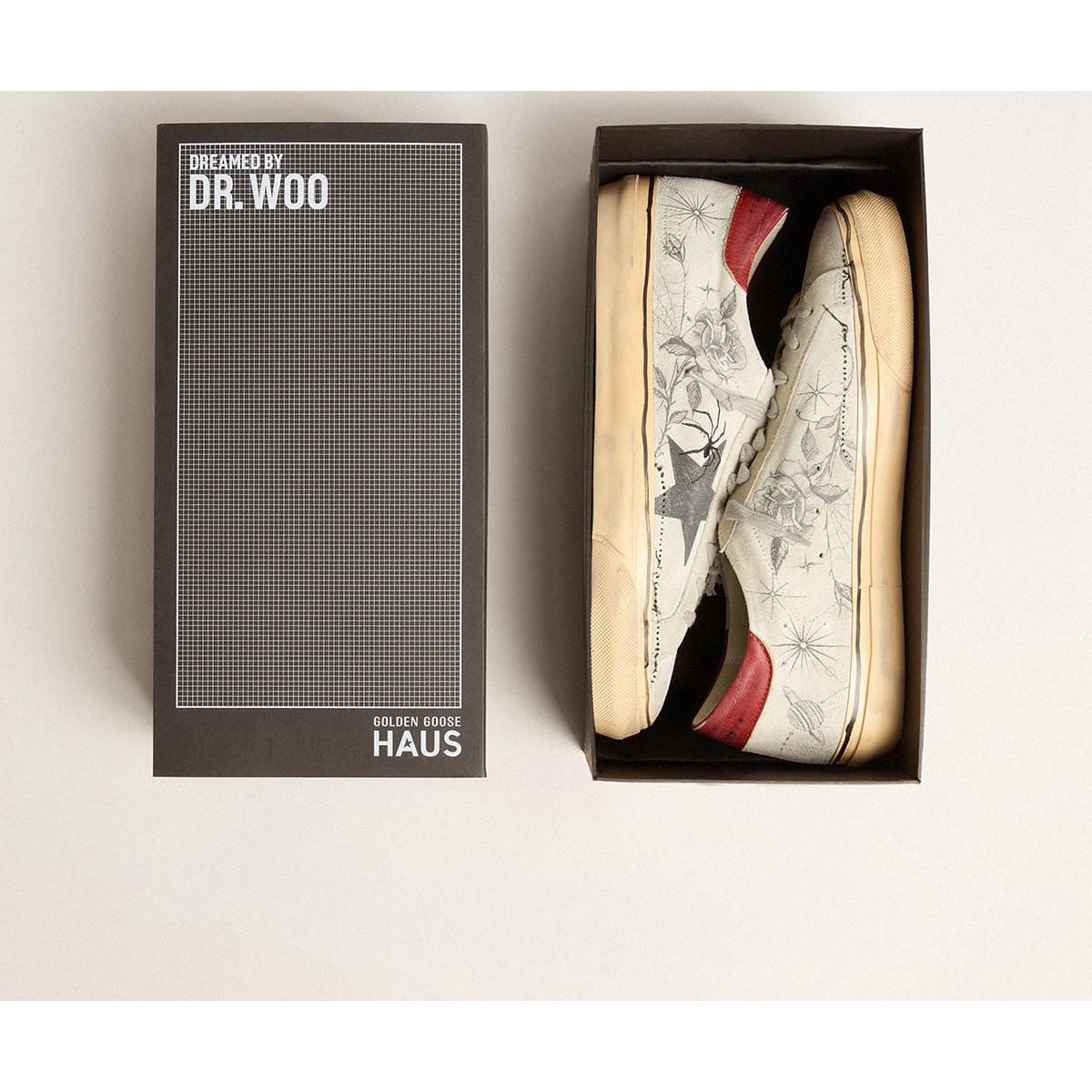 träumt von Dr. Woo. Dieser exklusive Frauen-Super-Star ist von der Künstlerin selbst mit Kunstwerken beladen, einschließlich eines 3D gestickten Details seines Markenzeichensymbols, der Spinne. Mit einem oberen in eisgrauen Krustenleder und einem schwarzen Stern verfügt er aufgerissene Flecken und eine gebrochene Spitze, die diese spitze Akzentuieren Sie das gelebte Finish. Eine Fersen -Registerkarte, deren beige Farbe allmählich enthüllt wird, desto mehr wird der Finishing Touch hinzugefügt. li>Haus der Träumer exklusiv