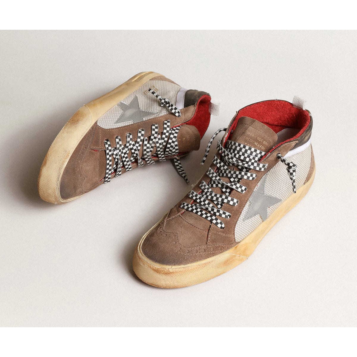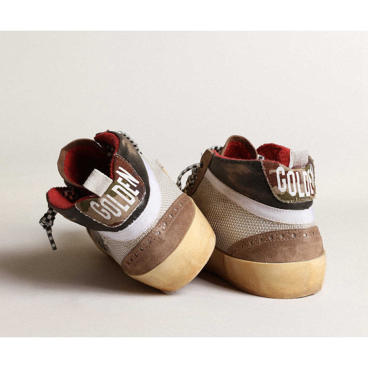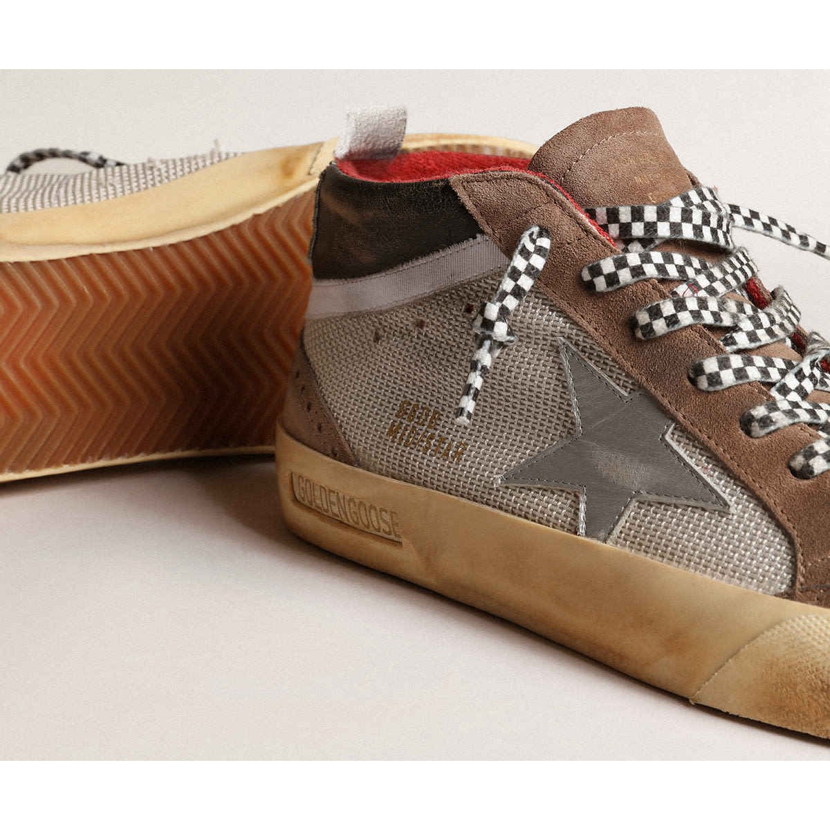 einzigartig elegante Vielseitigkeit: Die Mid -Star -Sneakers verfolgen eine raffinierte Annäherung an die Inspiration der Skate -Szene der Skate -Szene aus der achtziger Jahre. Mit einem hellen silbernen Netz und einem braunen Obermaterial mit glänzenden schwarzen Ledereinsätzen verfügt dieses Modell mit einem silbernen Lederstern und einem weißen Grosgrain -Blitz. Die Registerkarte RipStop Cotton Ferse im braunen Tarndruck und die schwarz -weißen karierten Schnürsenkel vervollständigen den Look. Leicht silbernd und braunes Wildleder -Obermaterial