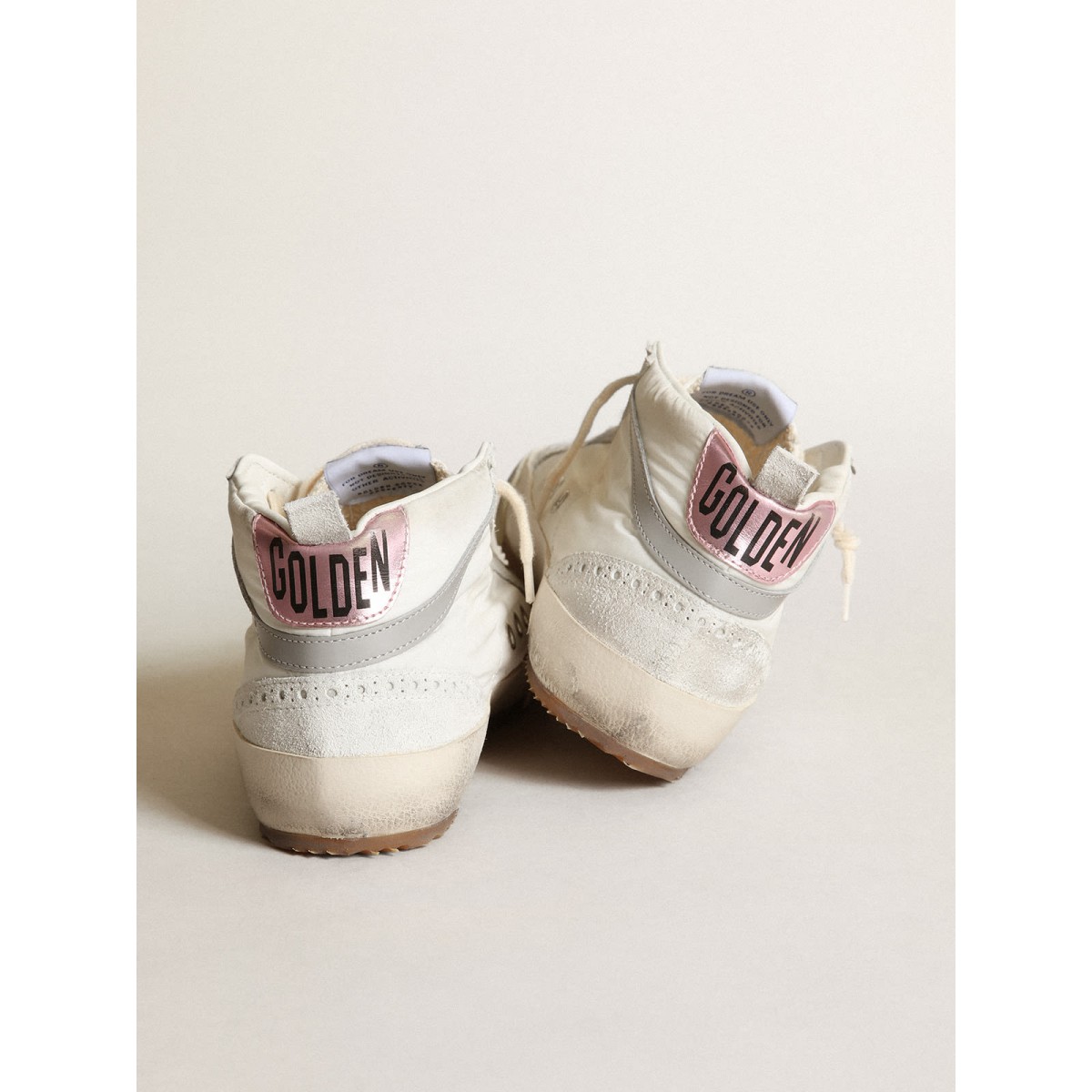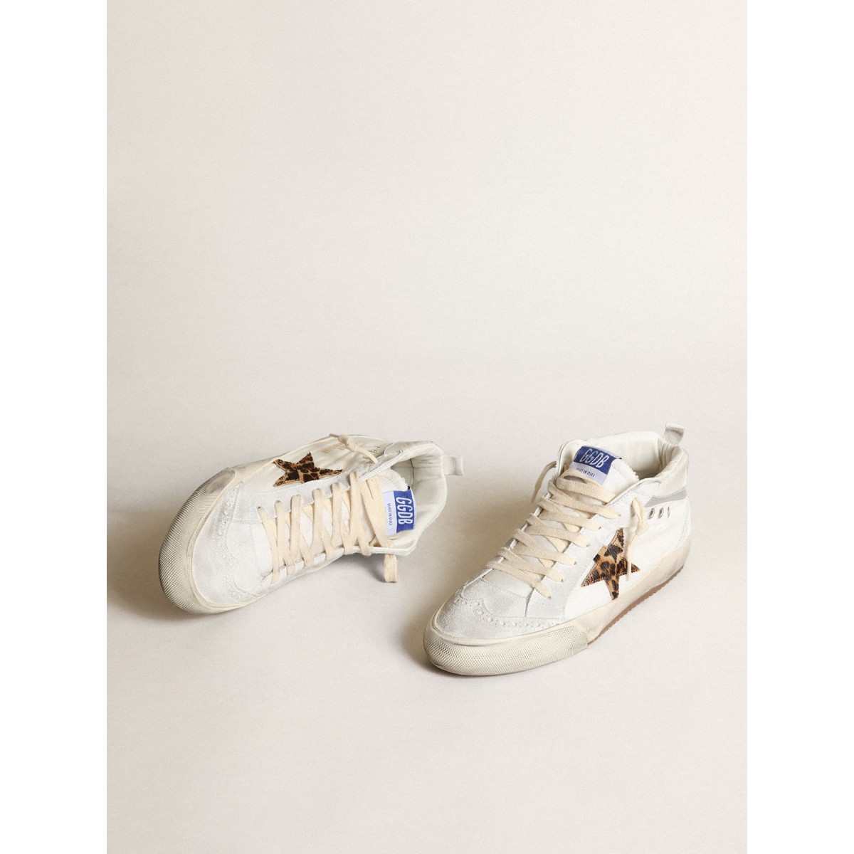 Eindeutig elegante Vielseitigkeit: Die Mid -Star -Sneakers verfolgen eine raffinierte Annäherung an die Inspiration der Skate -Szene der Skate -Szene aus den Jahren. Mit einem weißen Nylon-Obermaterial sind diese Turnschuhe mit Ton-on-Tone-Wildleder-Einsätzen und einem braunen Pony-Stern mit Leoparden-Print-Pony und einer pink-metallischen Lederfersenstange aus. Der graue Lederblitz, die Details und cremefarbene Schnürsenkel vervollständigen den Look.
