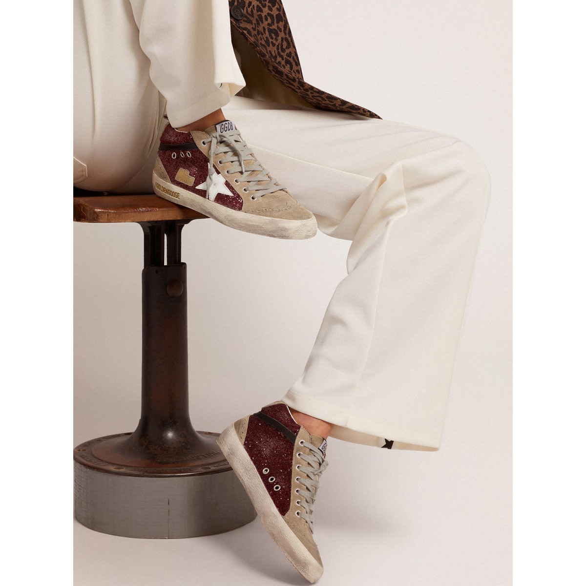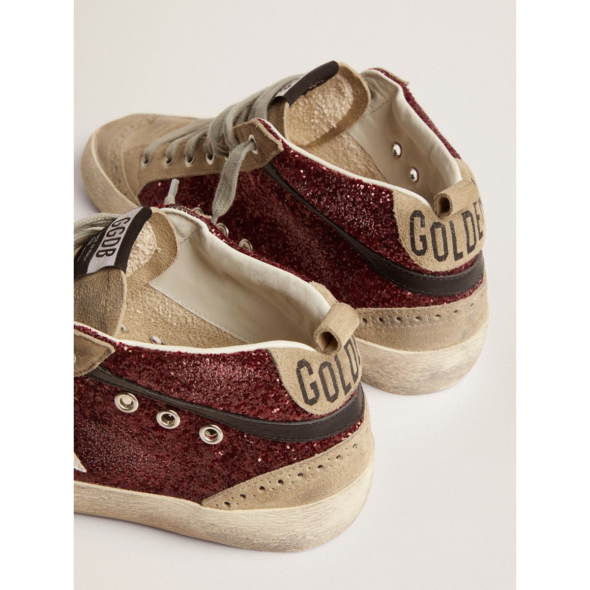 Eindeutig elegante Vielseitigkeit: Die Mid -Star -Sneakers verfolgen eine raffinierte Annäherung an die Inspiration der Skate -Szene der Skate -Szene aus den Jahren. Auf diesem Modell verfügt das obere Burgund-Glitzer-Obermaterial mit Tauben-Grau-Wildledereinsätzen, einem schwarzen Lederblitz und einem weißen Lederstern. Die Ice-Grau-Schnürsenkel und -Brohing-Details fügen einen stilvollen Schliff hinzu.>
