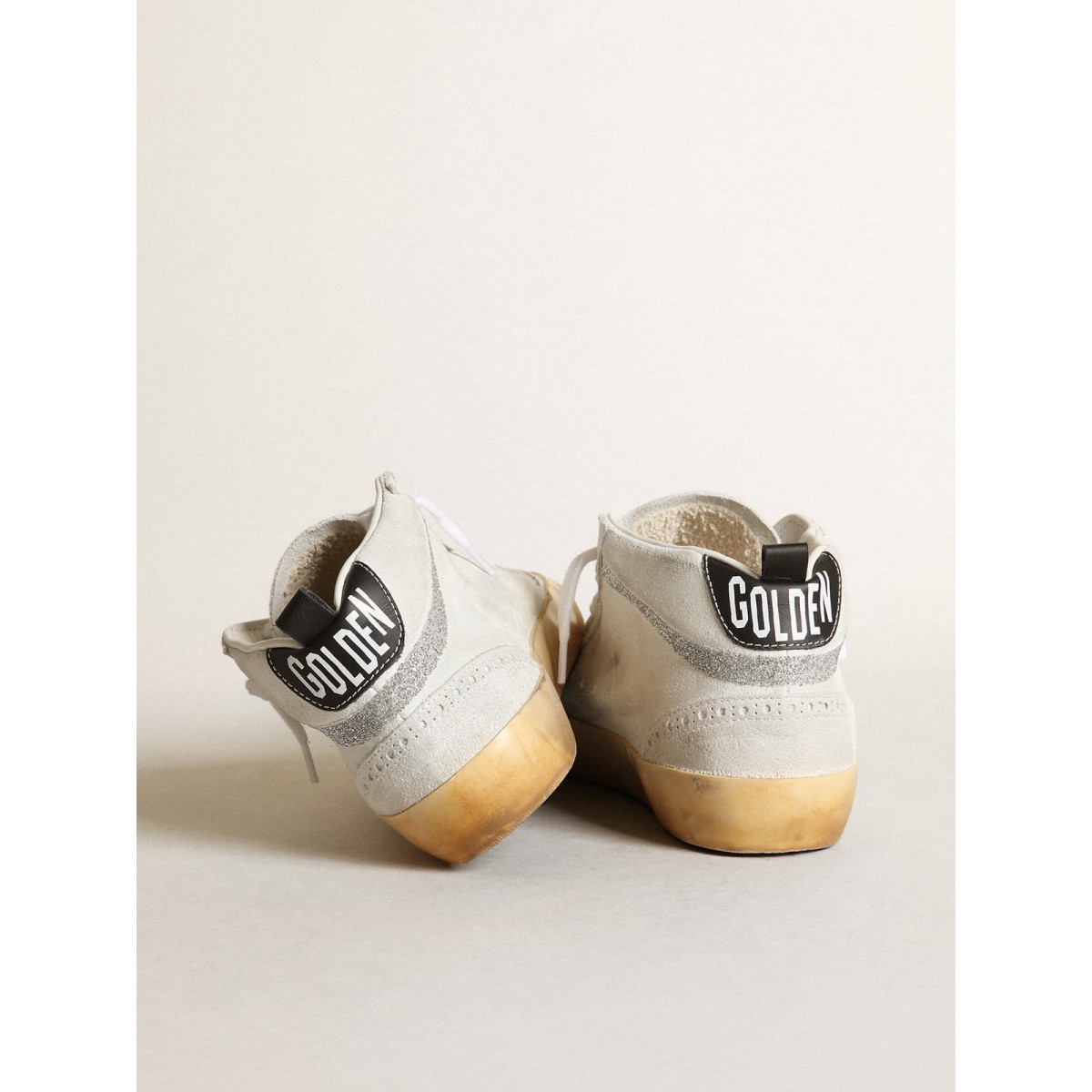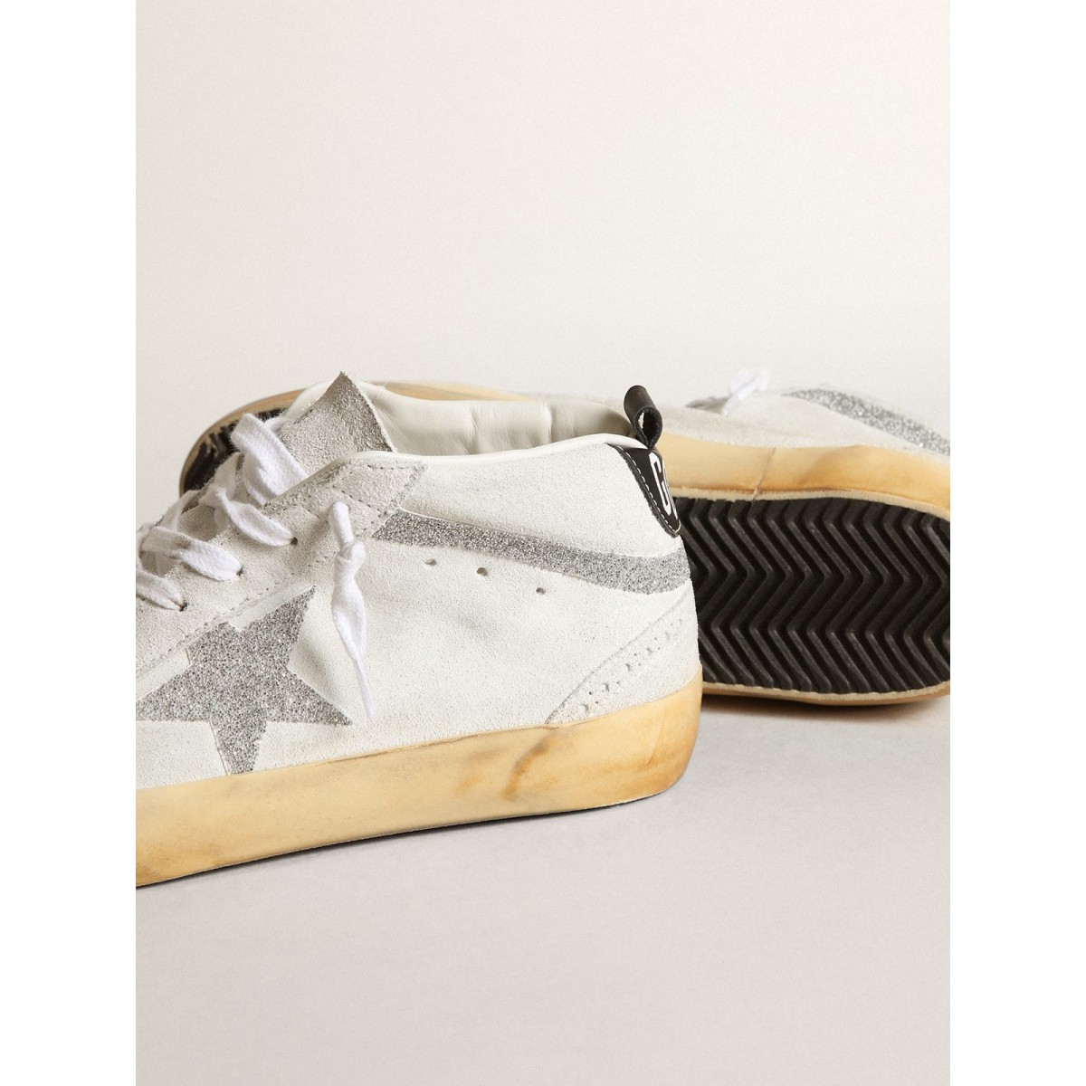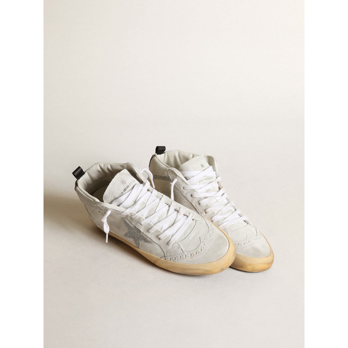 1 review for Golden Goose Mid Star Turnschuhe im weißen Wildleder mit Stern und Blitz in silbernen Swarovski-Mikrokristallen GWF00122.F003400.10981