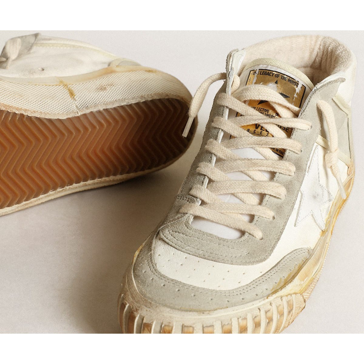 Eindeutig elegante Vielseitigkeit: Die Mid Star-Sneaker nehmen einen verfeinerten Herangehensweise an ihre Inspiration der Skate -Szene der achtziger Jahre. Mit einem weißen Nappa-Leder, das von eisgrauen Wildledereinsätzen akzentuiert wurde, verfügt dieses Frauenmodell über einen weißen Lederstern und einen Eisgrau-Wildlederblitz. Die strukturierten Effektfoxing und cremefarbene Schnürsenkel vervollständigen den Look. Oberes