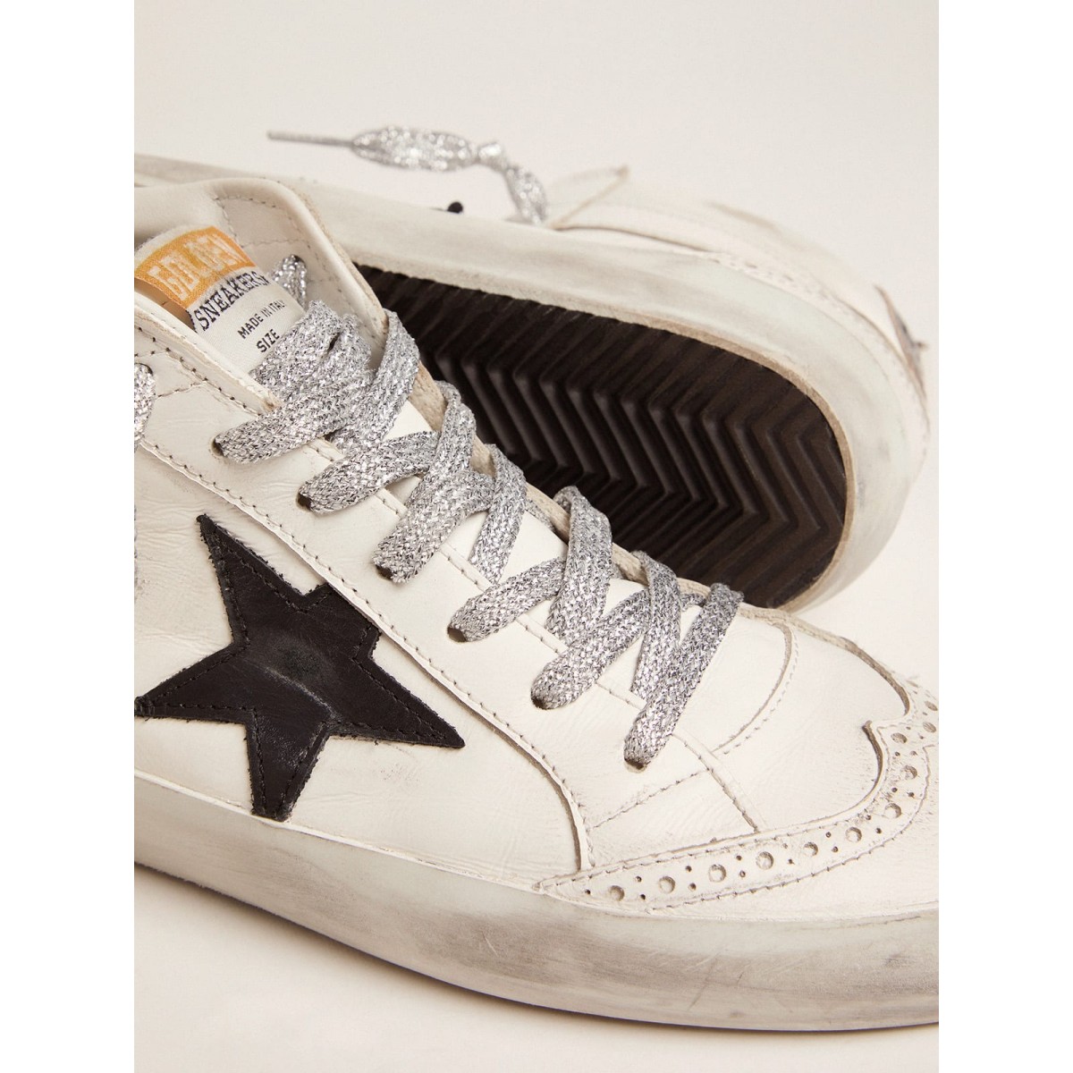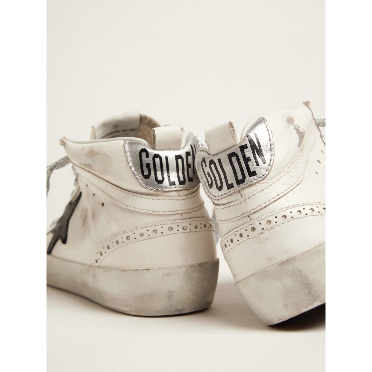 Ein ungezwungener Look, aber die Eleganz der Streetwear -Eleganz ausstrahlt: Ein Modell, das den Golden Goose -Stil dank der Verwendung exklusiver Behandlungen und Oberflächen interpretiert. Diese Mid-Star-Turnschuhe verfügen über eine weiße Leder-Obermaterial, eine laminierte Fersenlasche und einen schwarzen Stern. 100% Cowide Leder