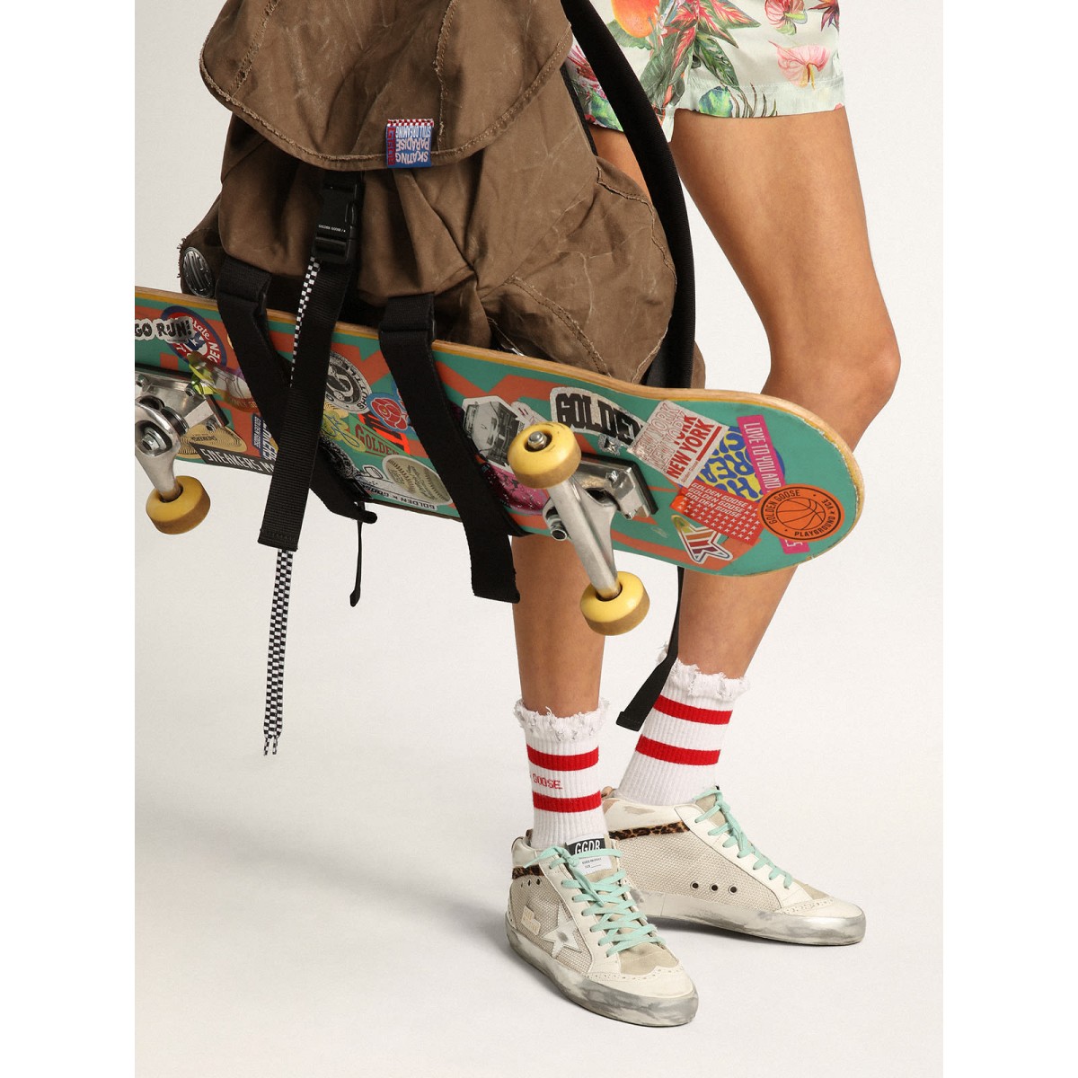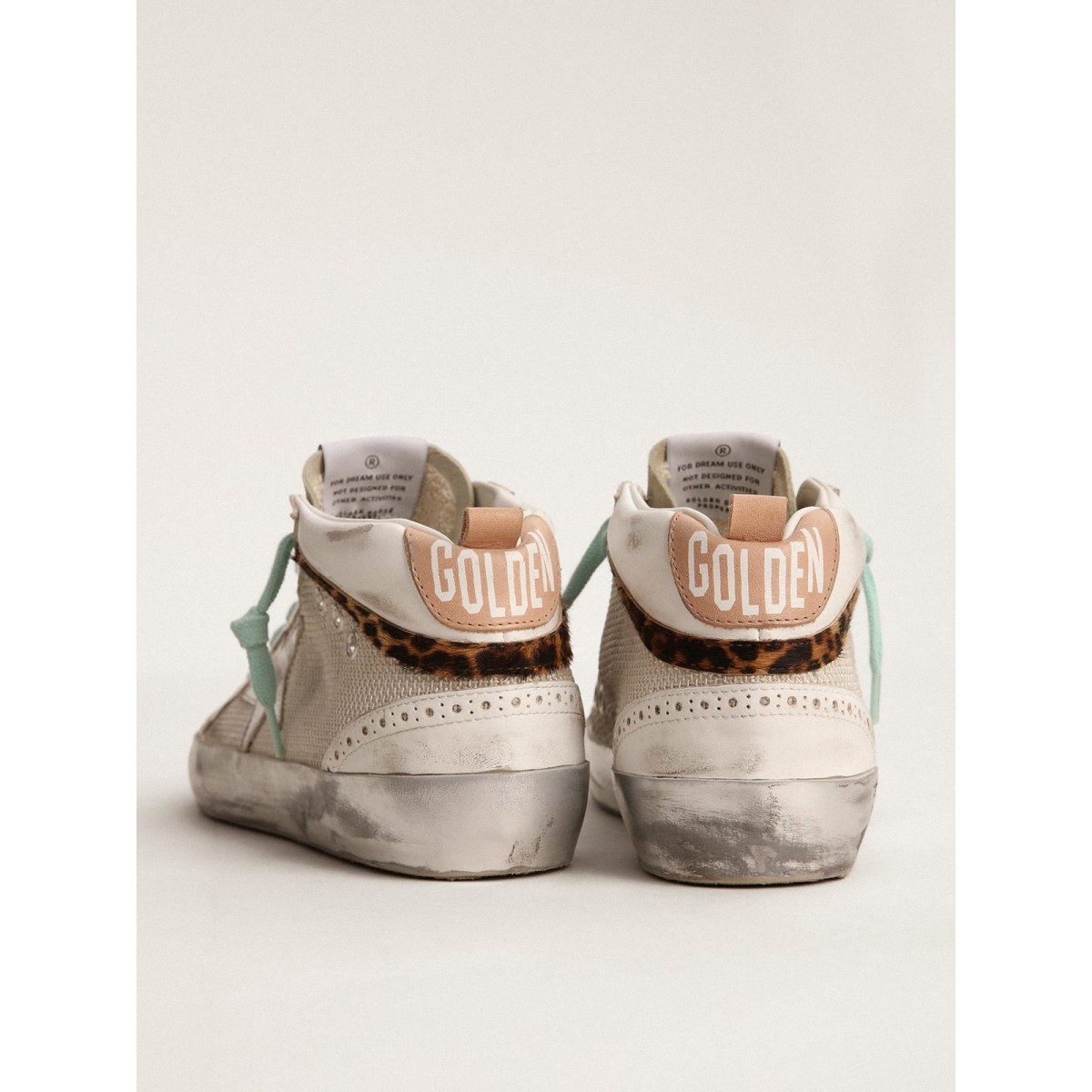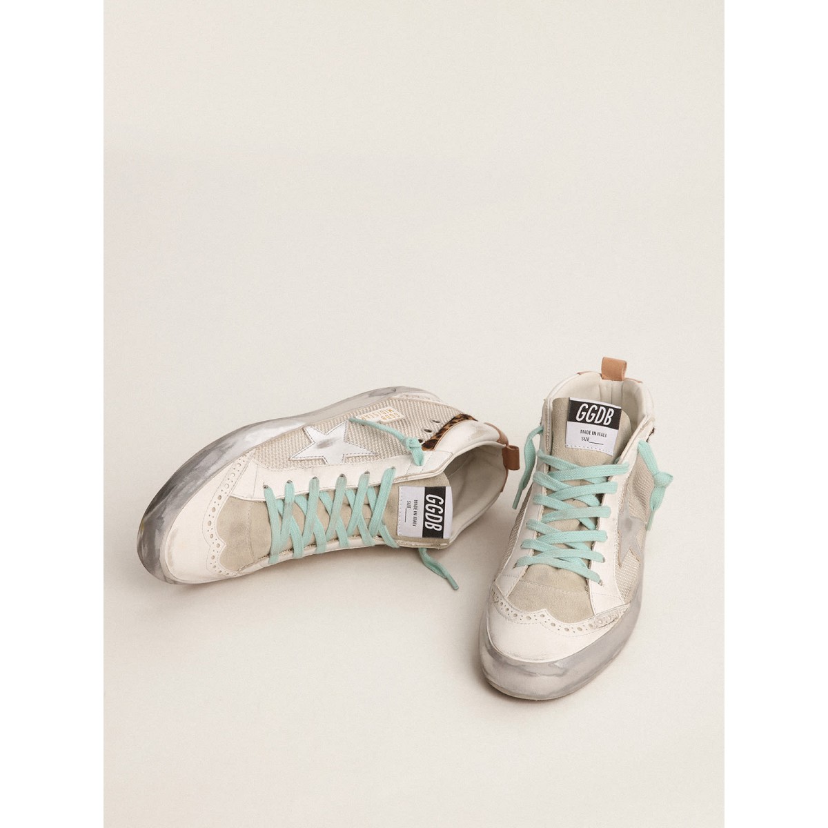 Eindeutig elegante Vielseitigkeit: Die Mid -Star -Sneakers verfolgen eine raffinierte Annäherung an die Inspiration der Skate -Szene der Skate -Szene aus den Jahren. Diese Turnschuhe mit einem Wasser und einem weißen und hellen silbernen Leder-Obermaterial bieten einen silbernen metallischen Lederstern und beige gefärbte Details, einschließlich der Lederferse-Tab und der Wildlederzunge. Der Leopard-Print-Pony-Hautblitz und Aqua-Green-Schnürsenkel vervollständigen den Look. Leder