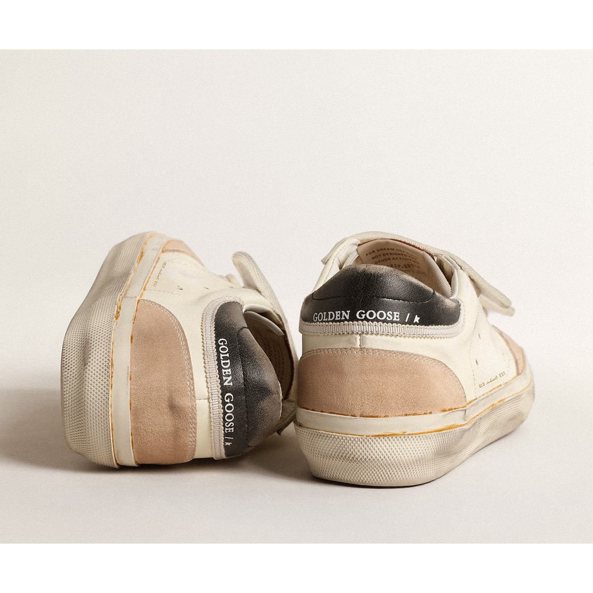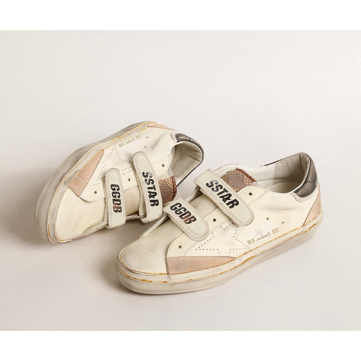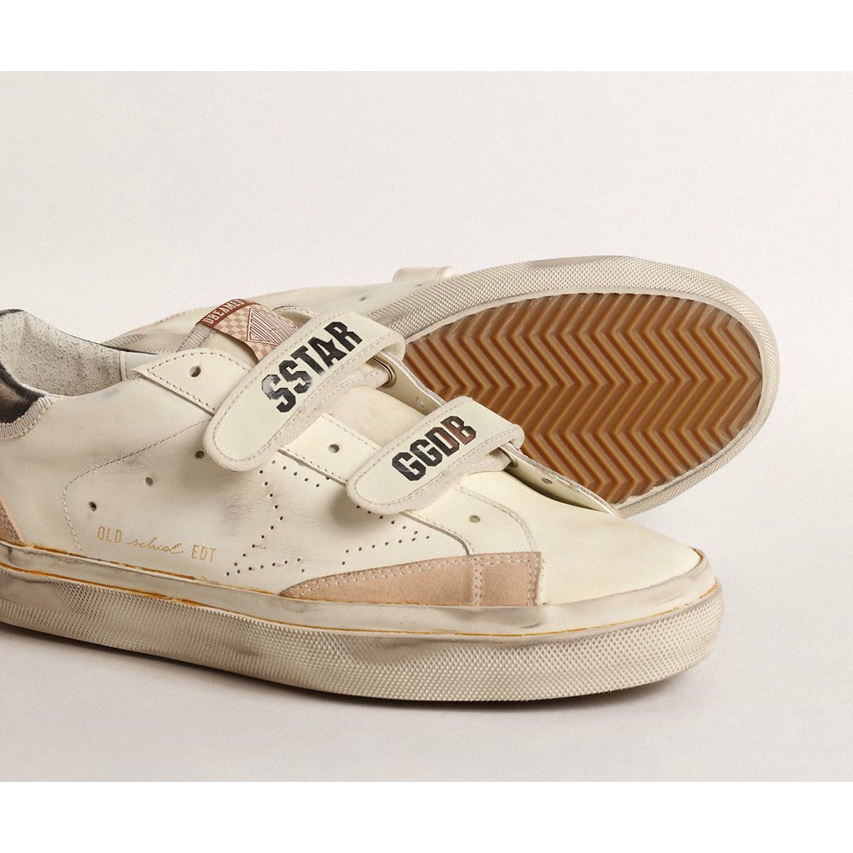 Unsere Turnschuhe der alten Schule verfügen über zwei Velcro -Träger auf der Vorderseite mit Kontrast mit Kontrastier Logo. Dieses LTD-Modell in weißem Leder verfügt über einen perforierten Stern und einen Vintage-Effekt-Black Leder-Ferse-Tab. Die nackten Wildledereinsätze und die weiße Verkleidung vervollständigen den Look.>
