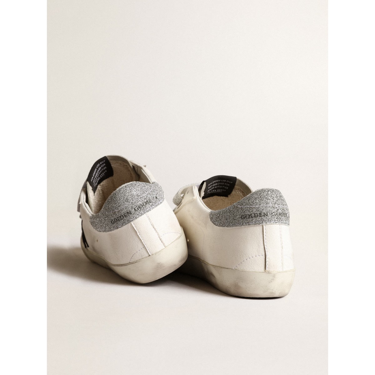 Unsere Turnschuhe der alten Schule verfügen über zwei Klettbänder auf der Vorderseite mit kontrastierendem Logo. Dieses Modell mit weißem Nappa-Leder-Obermaterial verfügt über einen schwarzen Wildlederstern und silberfarbene Swarovski-Kristalldetails wie die Fersenlasche und die Träger mit kontrastierendem schwarzem Logo. Die Zunge für Eisgrau Wildleder vervollständigt den Look.>Schwarzer Wildleder-Stern