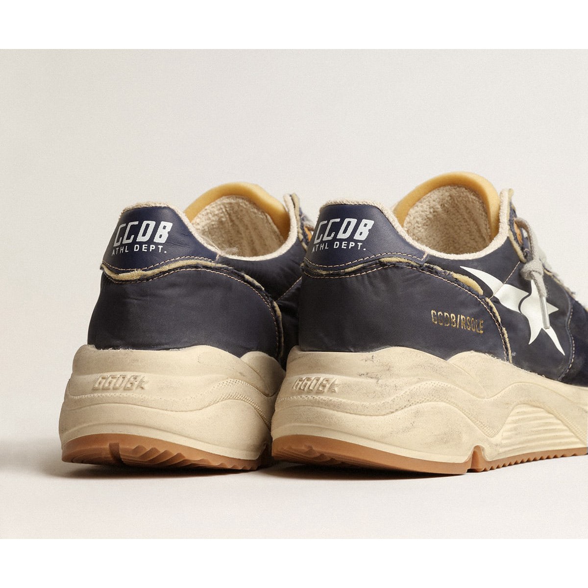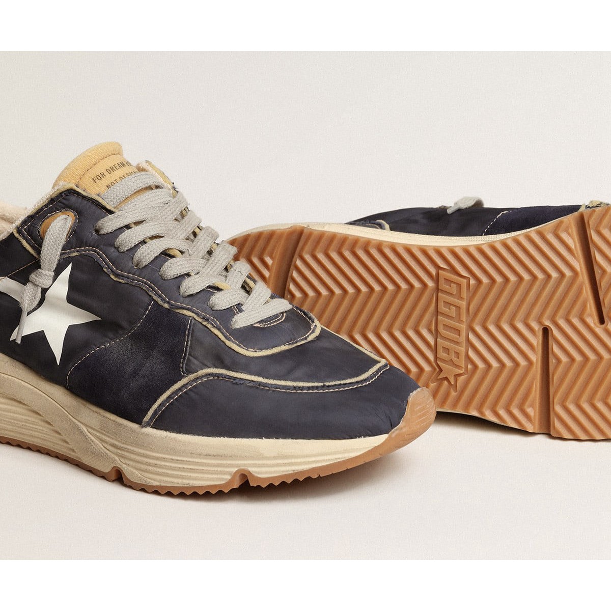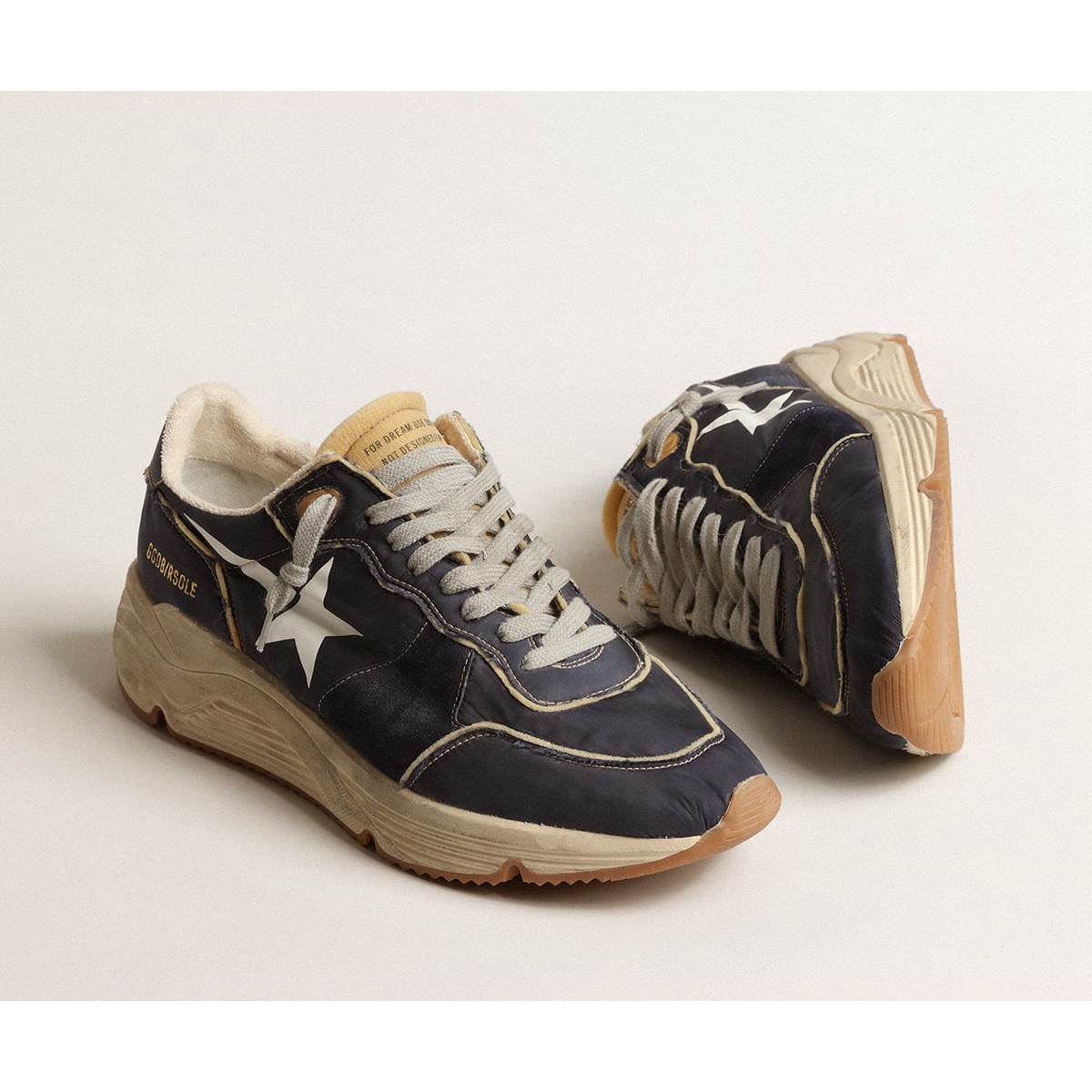 Urbaner Stil und ein Geist der Handwerkskunst werden in unseren laufenden Einzel -Sneakern kombiniert : Der ideale Begleiter für Ihre Metropolen -Abenteuer. Dieses Modell in dunkelblauem Nylon mit beige Schaumgummi -Details verfügt über einen weißen gedruckten Stern und einen dunkelblauen Lederfersenstab. Die dunkelblauen Wildledereinsätze und Eisgrau Schnürsenkel Fügen Sie den Finishing Touch hinzu. Nylon Upper mit Beige Foam Gummi -Details