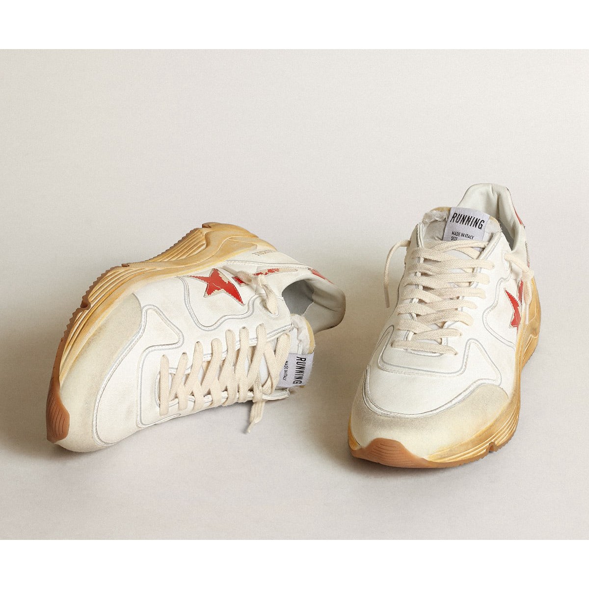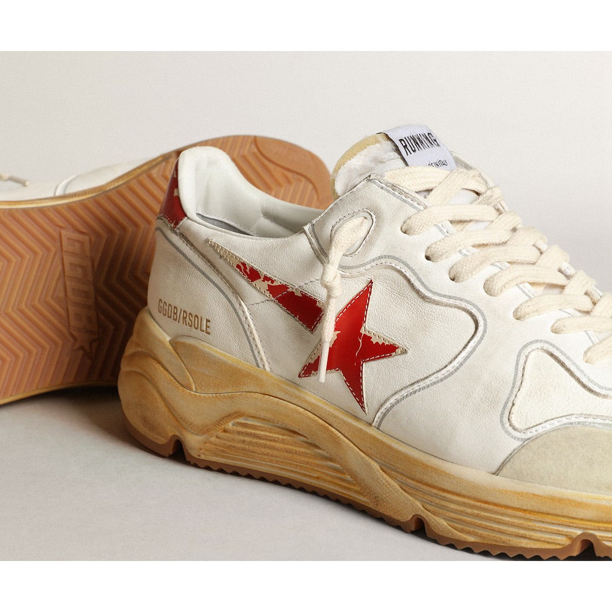 Urban Style und ein Geist der Handwerkskunst werden in unserem Lauf kombiniert Einzige Sneaker: Der ideale Begleiter für Ihre Metropolenabenteuer. Dieses Modell verfügt über ein weißes Nappa -Leder -Obermaterial mit einem Stern- und Fersen -Tab in Leder mit rotem Digitaldruck. Die weiße Nylonzunge und cremefarbene Schnürsenkel Fügen Sie den Finishing-Touch hinzu. Upper