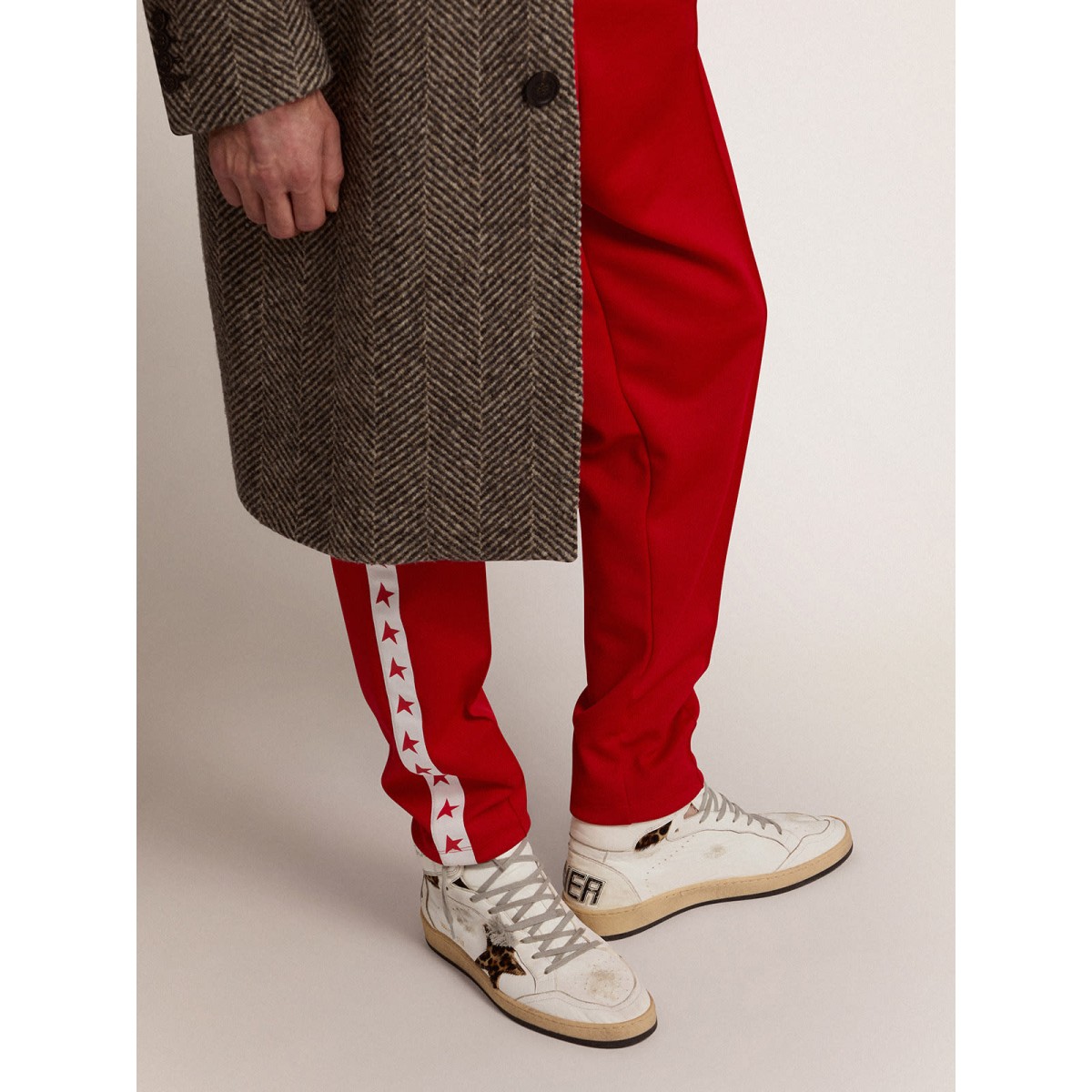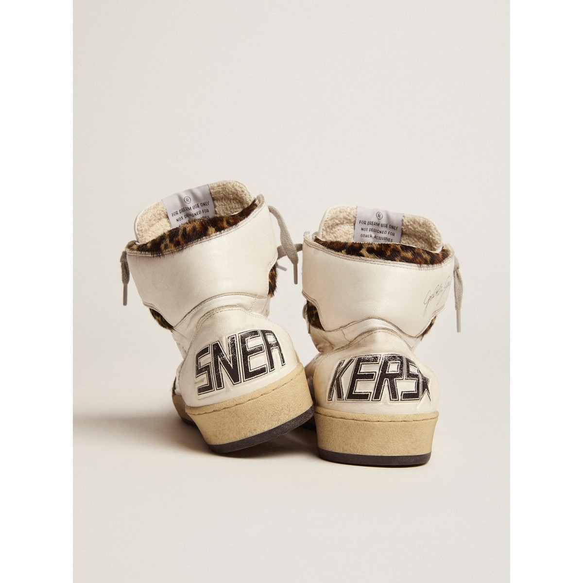 Eine Neuinterpretation von High-Top-Turnschuhen mit einer authentischen Seele: Inspiriert von unserem Ballsternmodell haben unsere Sky-Star-Sneakers eine amerikanische College-Atmosphäre und ein Gefühl der Basketball-Szene der achtziger Jahre. Dieses Herrenmodell aus weißem Nappa-Leder mit Leoparden-Druck-Pony-Hauteinsätzen hergestellt und verfügt>Details: