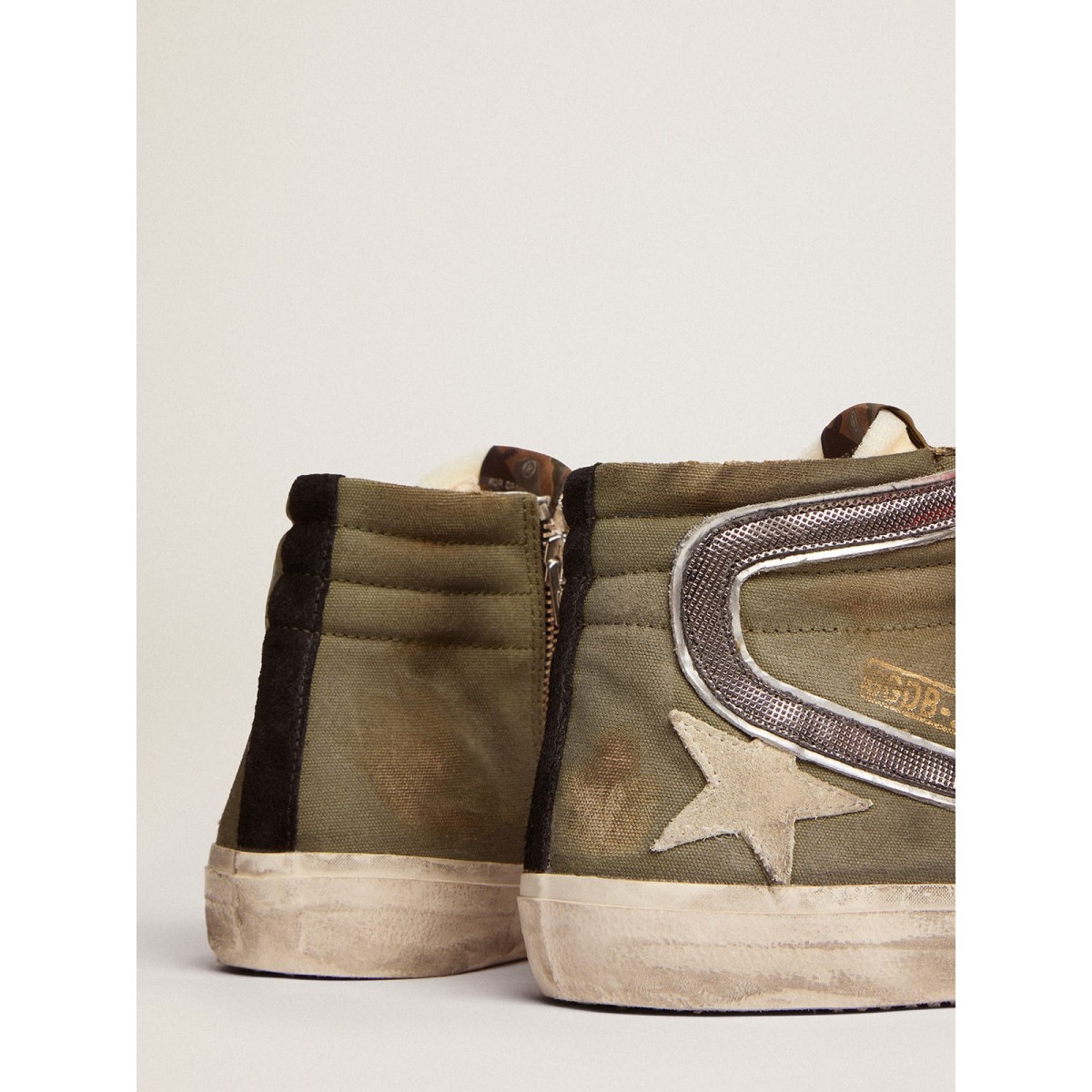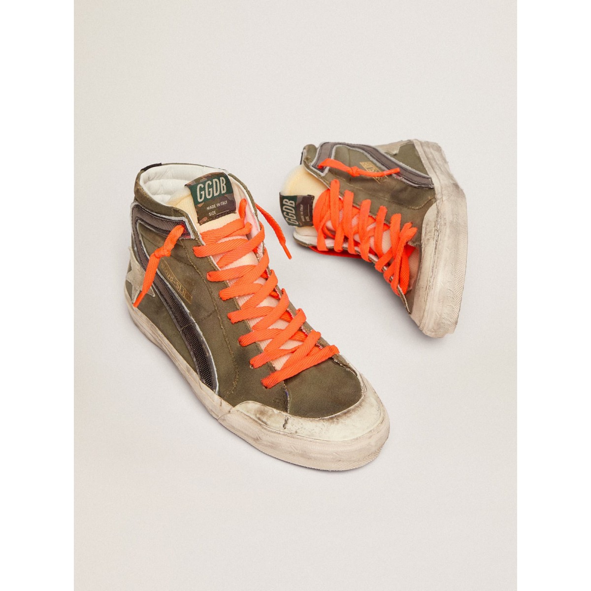 Skate -Seele, glamouröse Haltung. Unsere Rutschen -Turnschuhe bringen Sie direkt nach Venice Beach zwischen einem Ollie und einem Kickflip. Mit einem Obermaterial der Armeegrün-Leinwand enthält dieses Modell Wildlederdetails wie den Eisstern und die schwarze Fersenlasche. Der mit silbernen laminierte Leder und den Orangenschnürsenkel aus silbernen laminierte Leder und den Orangenschnüre vervollständige den Look. UPR GREEN GREEN CANMEVAS UPPER