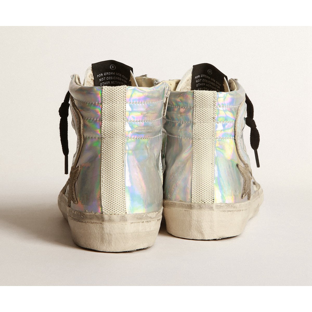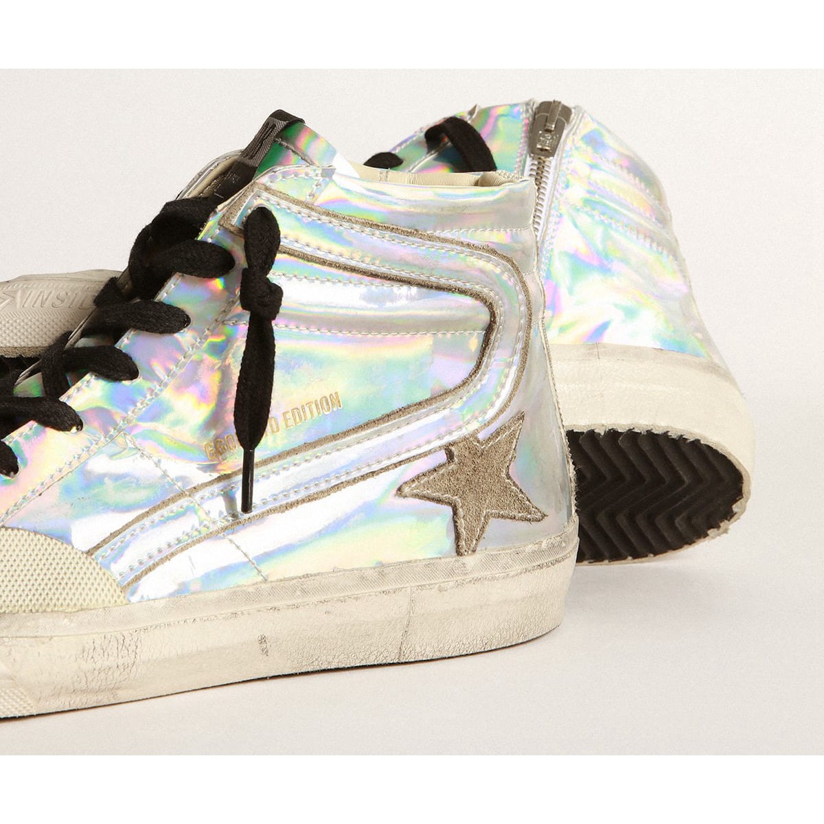 Skate Soul, glamouröse Haltung. Unsere Rutschen -Turnschuhe bringen Sie direkt nach Venice Beach zwischen einem Ollie und einem Kickflip. Diese limitierten, nummerierten Männerlabor-Sneakers haben einen Ober- und Blitz in Silberstoff mit holographischer Effekt, gegen den die Eisdarsteller, Stern- und Blitzkanten herausstechen. Die Fersenlasche in weißem Gummi mit einem texturierten Effekt, der das Fuchs spiegelt, sowie die schwarzen Schnürsenkel fügen Sie den Finishing -Treffer hinzu. /p>
