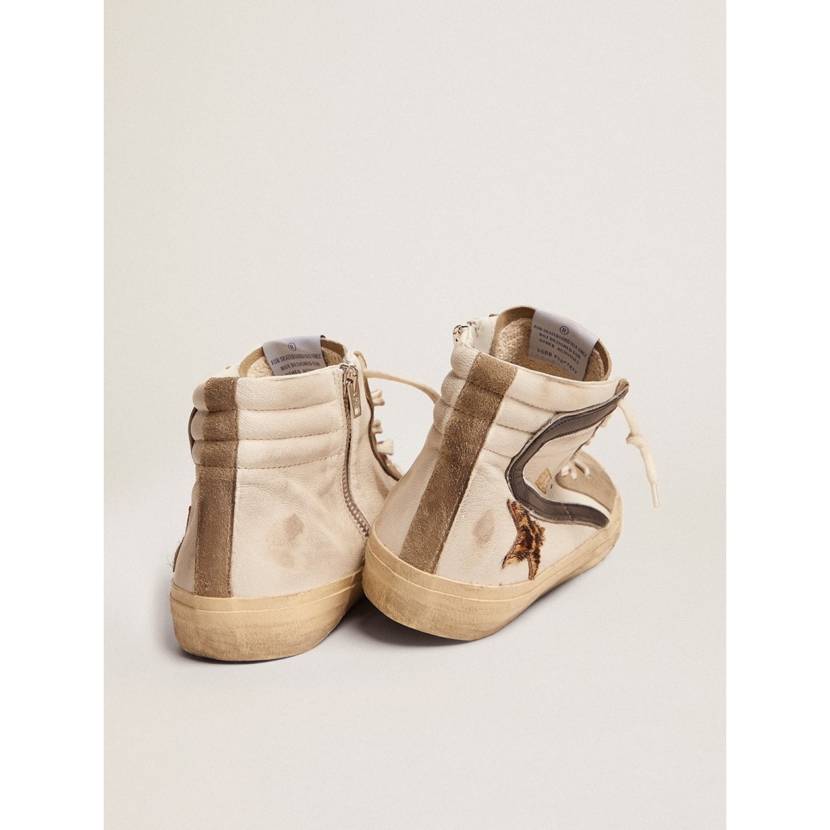 Skate -Seele, glamouröse Haltung. Unsere Rutschen -Turnschuhe bringen Sie direkt nach Venice Beach zwischen einem Ollie und einem Kickflip. Dieses Modell mit einem weißen Nappa-Leder, das durch den schwarzen Lederblitz mit silberlaminiertem Lederkanten akzentuiert wird, verfügt über einen Pony-Stern mit Leoparden-Print-Pony-Stern und dove-grau-Wildlederzunge und Einsätze. Und weiße Schnürsenkel Fügen Sie den letzten Schliff hinzu. -print Pony Hautstern
