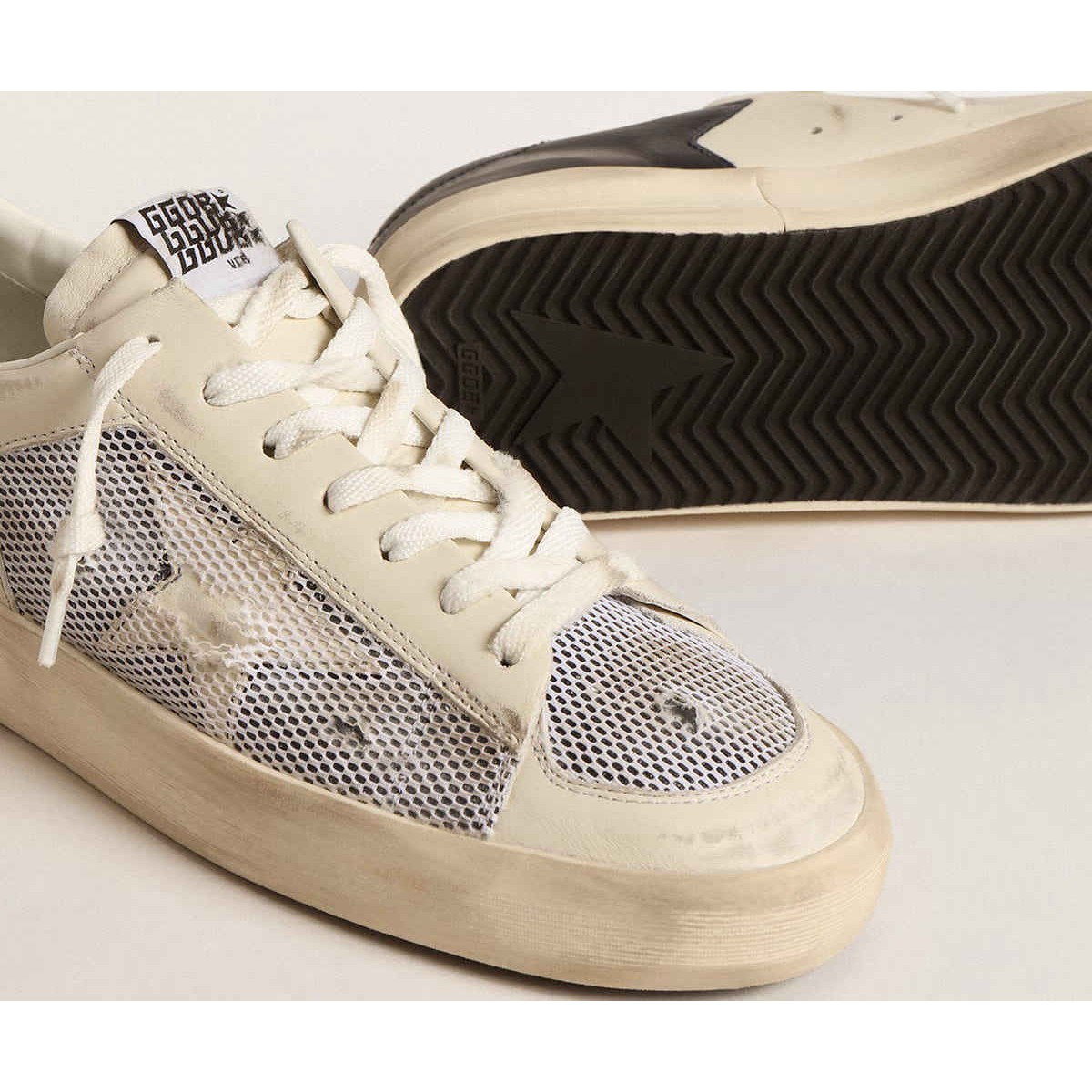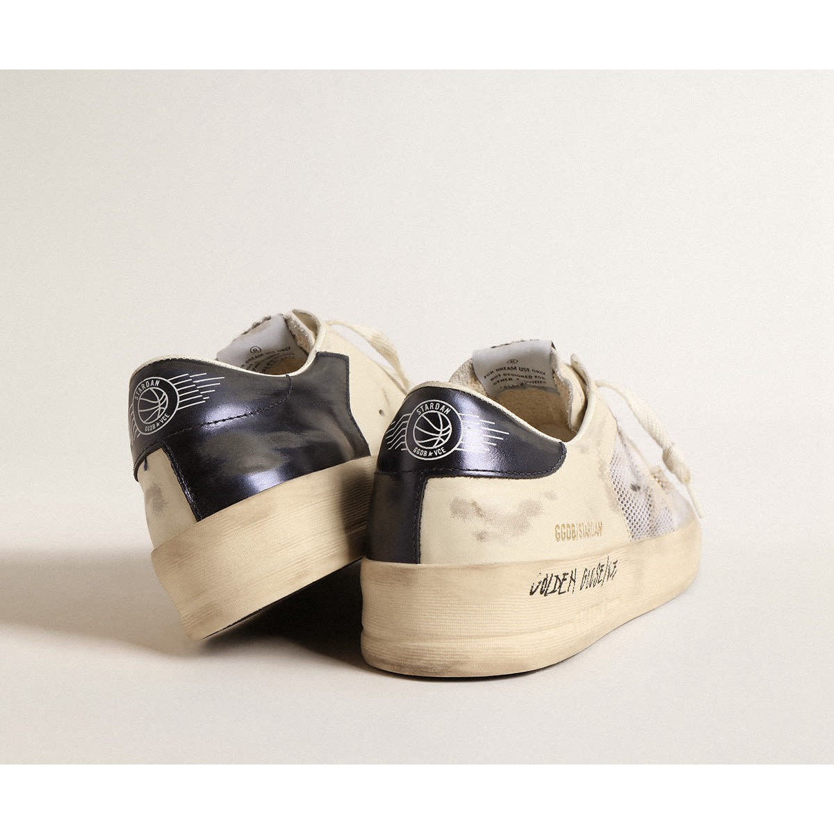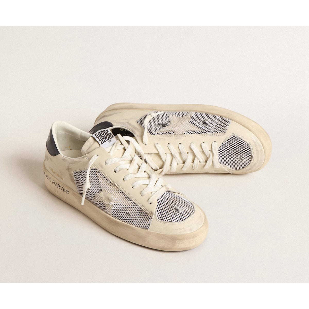Golden Goose Herren’s Stardan Ltd in weißem Leder und Netz mit blauem metallischen Absatz Tab