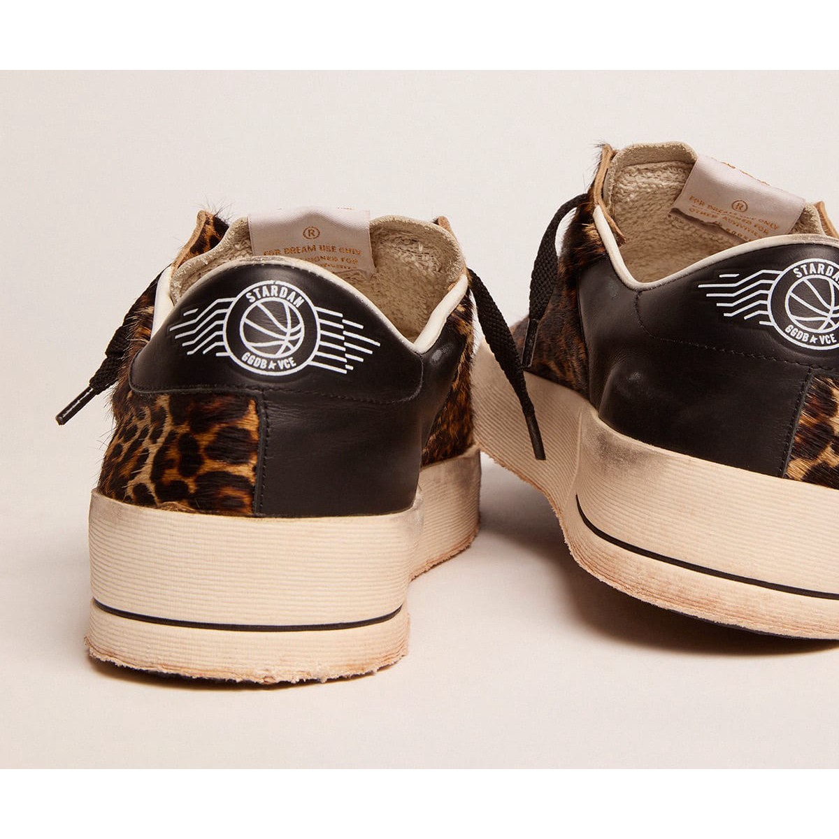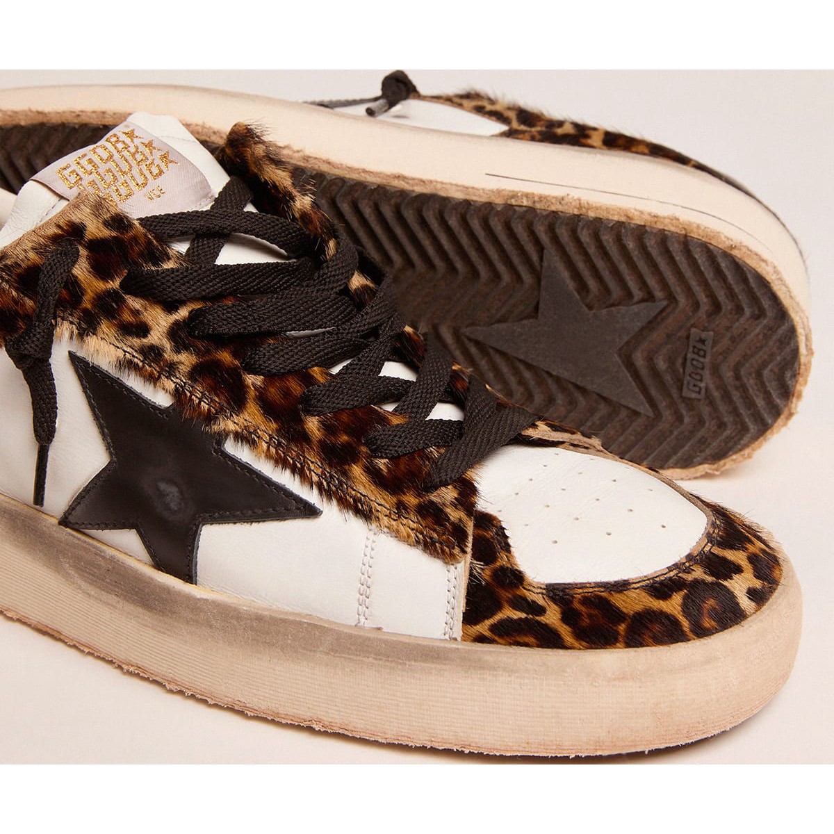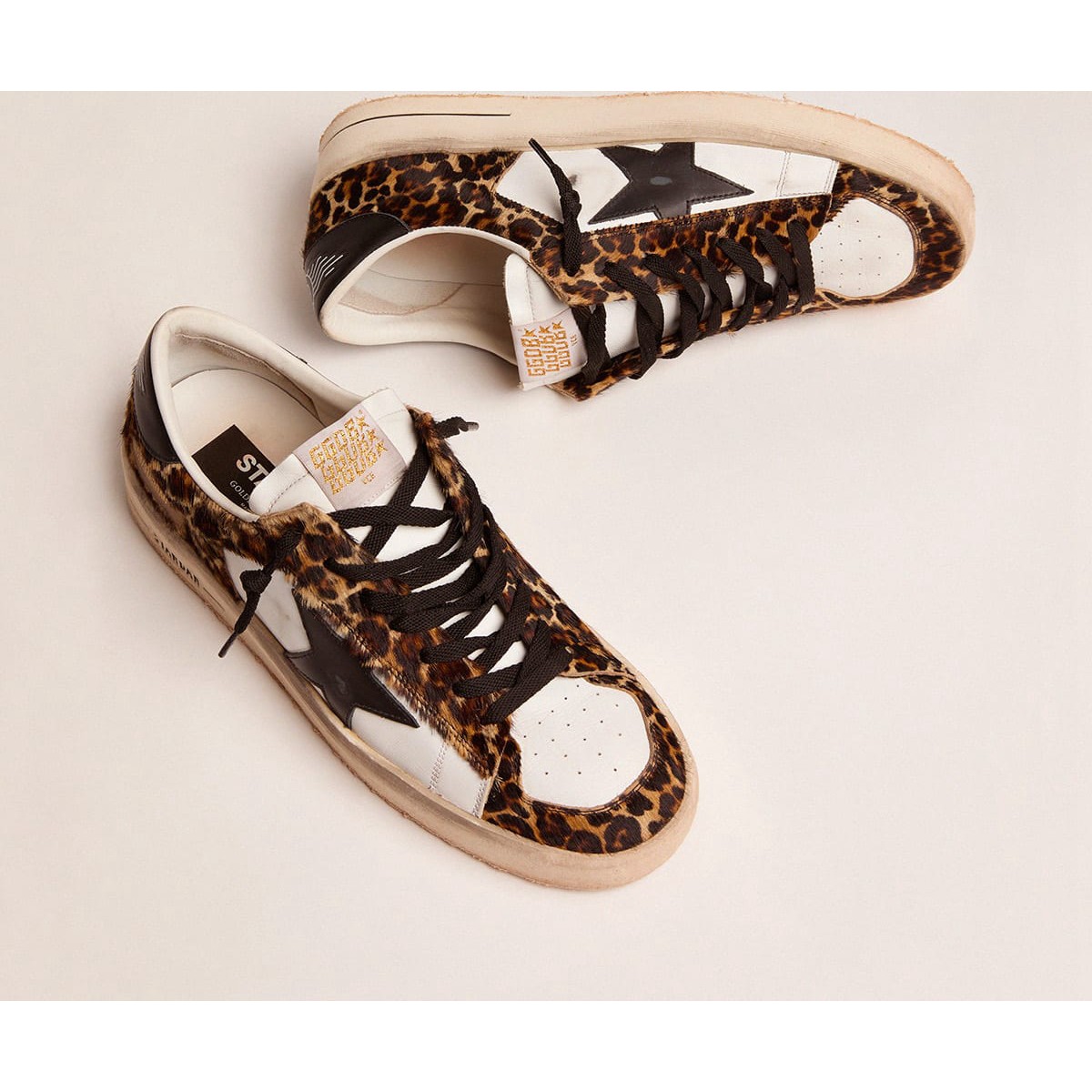 Die glorreichen Neunziger, die in einem Sneaker eingewickelt sind. Die Stardan -Turnschuhe huldigen den Basketballikonen dieses Jahrzehnts und halten die Gegenwart im Auge. Diese Version verfügt über ein weißes Leder- und Leoparden-Print-Pony-Haut-Obermaterial. Der schwarze Lederstern und die Fersen-Registerkarte Fügen Sie die letzten Schliff hinzu. und weißes Leder -Obermaterial
