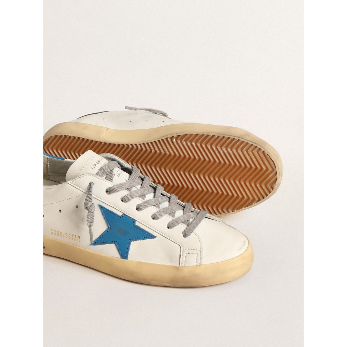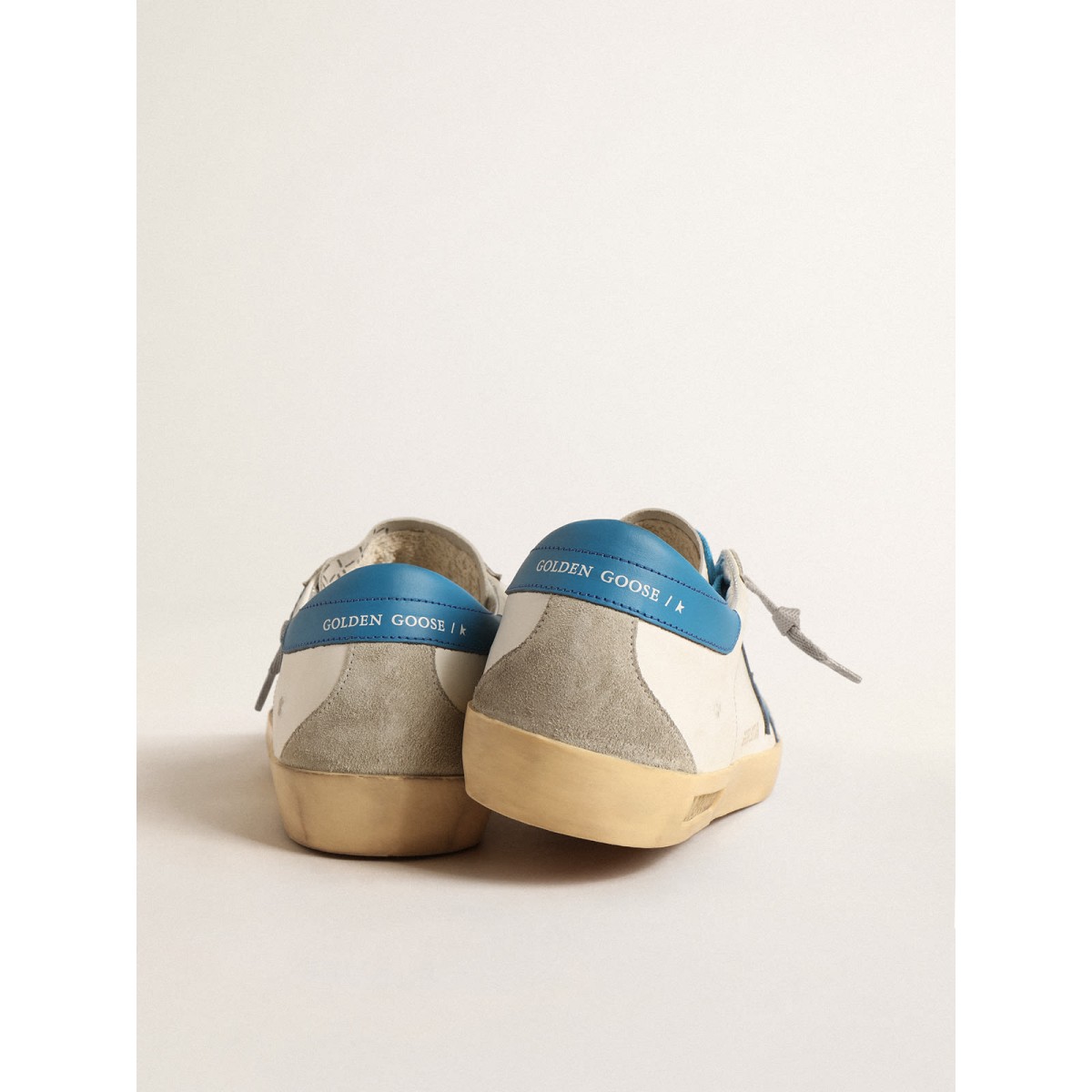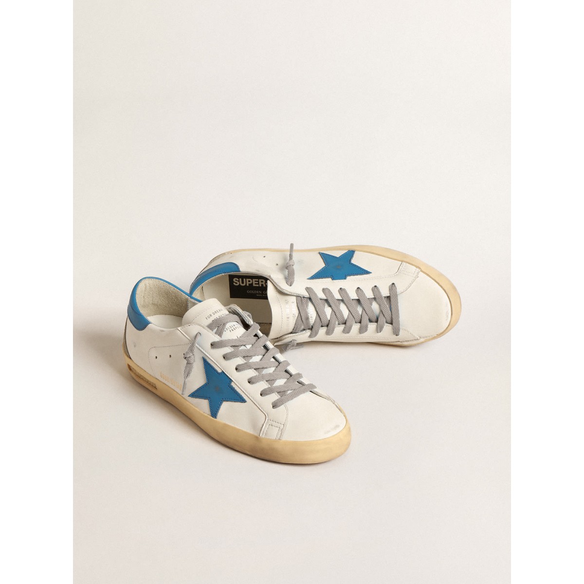 Eine zeitlose Ikone, die sich doch ständig weiterentwickelt. Bei Golden lieben wir es, unsere Klassiker zu nehmen und sie ständig zu überarbeiten, immer aus einem neuen Blickwinkel. Dieser Superstar mit einem weißen Nappa-Leder-Obermaterial bietet einen hellblauen Lederstern und Fersenlaschen. Der Eisgrau-Wildledereinsatz auf der Rück- und Eisgrau-Schnürsenkeln fügen den Finishing-Touch hinzu. Nappa Leder Upper